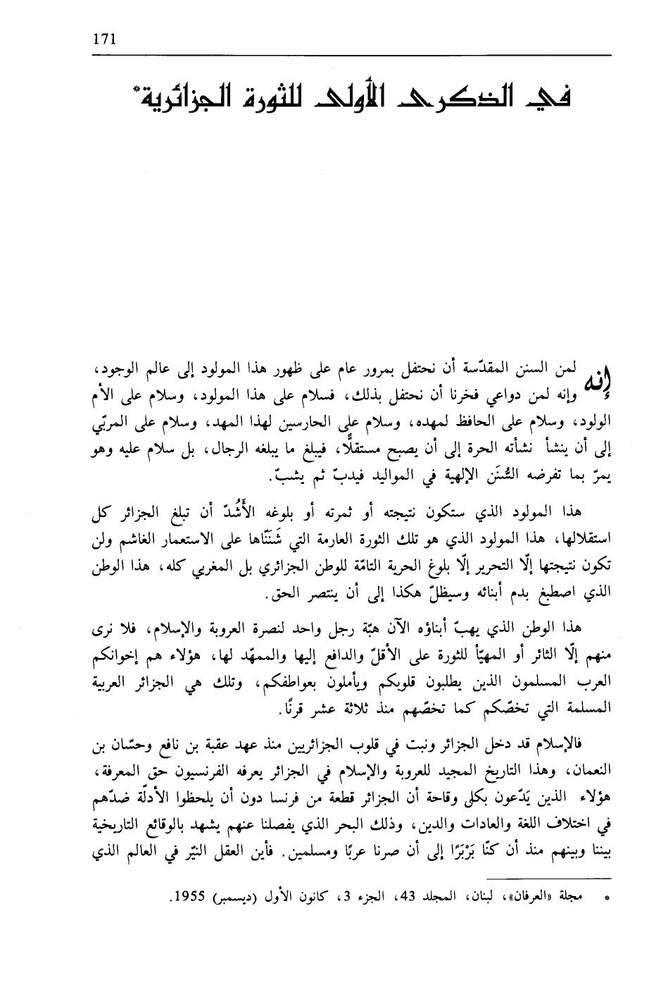 هذا المولود الذي ستكون نتيجته أو ثمرته أو بلوغه الأَشُدّ أن تبلغ الجزائر كل استقلالها، هذا المولود الذي هو تلك الثورة العارمة التي شَنَنّاها على الاستعمار الغاشم ولن تكون نتيجتها إلا التحرير إلّا بلوغ الحرية التامّة للوطن الجزائري بل المغربي كله، هذا الوطن الذي اصطبغ بدم أبنائه وسيظلّ هكذا إلى أن ينتصر الحق.