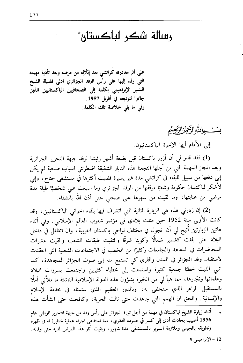 على أثر مغادرته كراتشي بعد إبْلَالِه من مرضه وبعد تأدية مهمته التي وفد إليها على رأس الوفد الجزائري أدلى فضيلة الشيخ البشير الإبراهيمي بكلمة إلى الصحافيين الباكستانيين الذين جاءُوا لتوديعه في أفريل 1957.