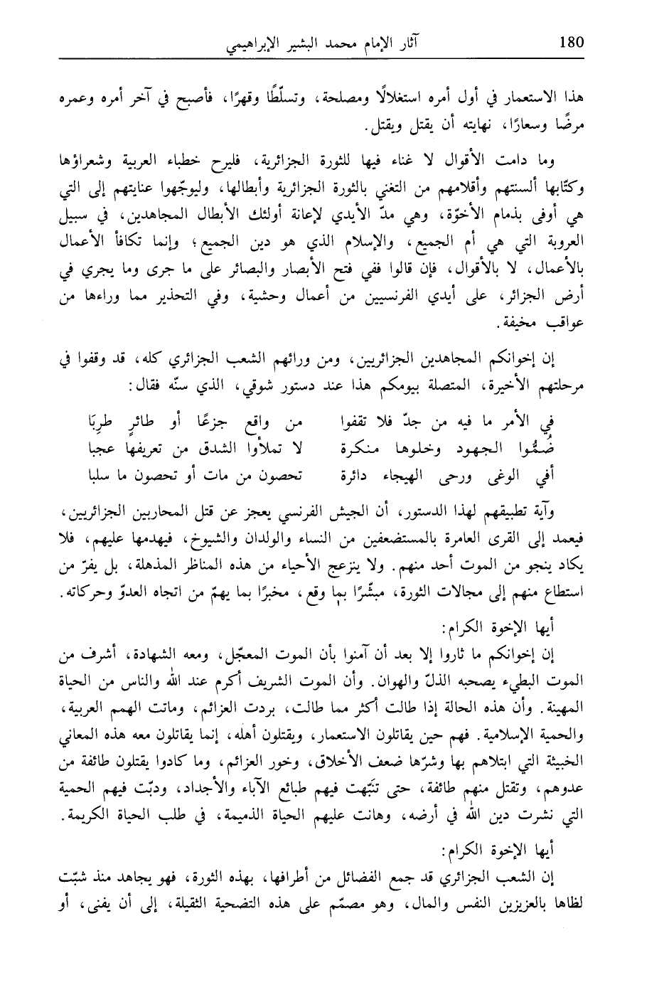 إن إخوانكم المجاهدين الجزائريين، ومن ورائهم الشعب الجزائري كله، قد وقفوا في مرحلتهم الأخيرة، المتصلة بيومكم هذا عند دستور شوقي، الذي سنّه فقال: