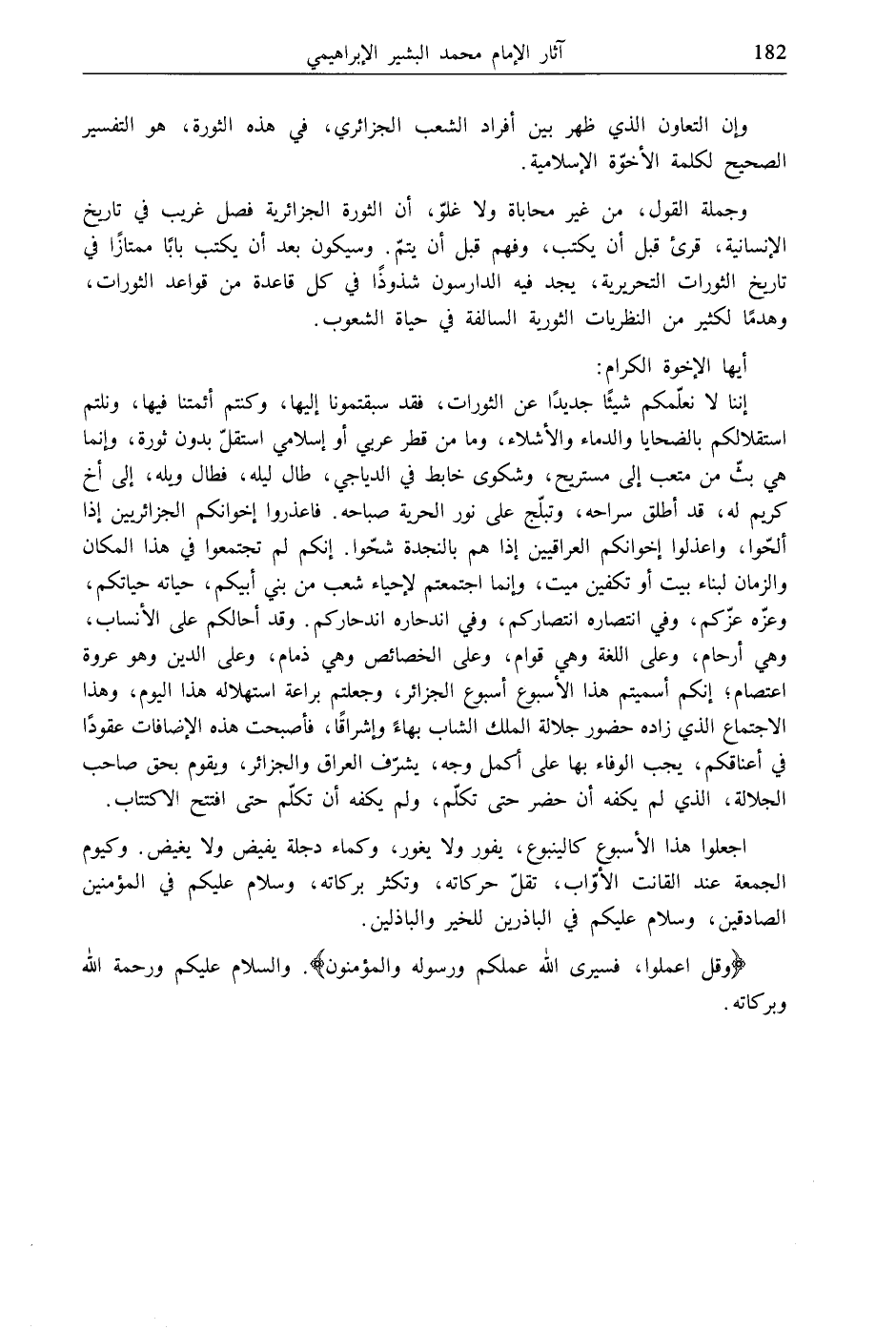 إننا لا نعلّمكم شيئًا جديدًا عن الثورات، فقد سبقتمونا إليها، وكنتم أئمتنا فيها، ونلتم استقلالكم بالضحايا والدماء والأشلاء، وما من قطر عربي أو إسلامي استقلّ بدون ثورة، وإنما هي بثّ من متعب إلى مستريح، وشكوى خابط في الدياجي، طال ليله، فطال ويله، إلى أخ كريم له، قد أطلق سراحه، وتبلّج على نور الحرية صباحه. فاعذروا إخوانكم الجزائريين إذا ألحّوا، واعذلوا إخوانكم العراقيين إذا هم بالنجدة شحّوا. إنكم لم تجتمعوا في هذا المكان والزمان لبناء بيت أو تكفين ميت، وإنما اجتمعتم لإحياء شعب من بني أبيكم، حياته حياتكم، وعزّه عزّكم، وفي انتصاره انتصاركم، وفي اندحاره اندحاركم. وقد أحالكم على الأنساب، وهي أرحام، وعلى اللغة وهي قوام، وعلى الخصائص وهي ذمام، وعلى الدين وهو عروة اعتصام؛ إنكم أسميتم هذا الأسبوع أسبوع الجزائر، وجعلتم براعة استهلاله هذا اليوم، وهذا الاجتماع الذي زاده حضور جلالة الملك الشاب بهاءً وإشراقًا، فأصبحت هذه الإضافات عقودًا في أعناقكم، يجب الوفاء بها على أكمل وجه، يشرّف العراق والجزائر، ويقوم بحق صاحب الجلالة، الذي لم يكفه أن حضر حتى تكلّم، ولم يكفه أن تكلّم حتى افتتح الاكتتاب.