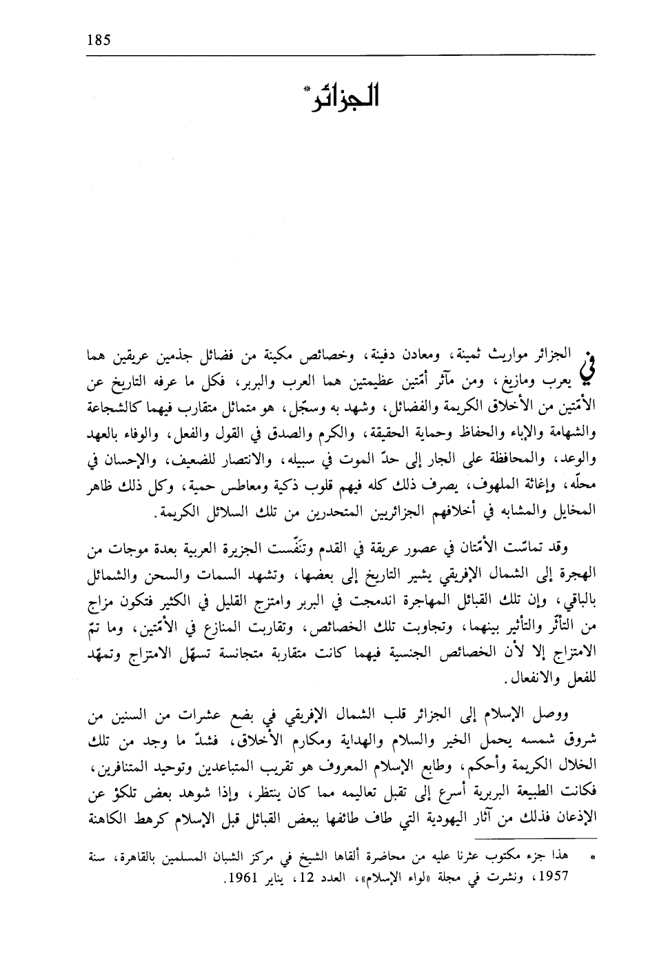 في الجزائر مواريث ثمينة، ومعادن دفينة، وخصائص مكينة من فضائل جذمين عريقين هما يعرب ومازيغ، ومن مآثر أمّتين عظيمتين هما العرب والبربر، فكل ما عرفه التاريخ عن الأمّتين من الأخلاق الكريمة والفضائل، وشهد به وسجّل، هو متماثل متقارب فيهما كالشجاعة والشهامة والإباء والحفاظ وحماية الحقيقة، والكرم والصدق في القول والفعل، والوفاء بالعهد والوعد، والمحافظة على الجار إلى حدّ الموت في سبيله، والانتصار للضعيف، والإحسان في محلّه، وإغاثة الملهوف، يصرف ذلك كله فيهم قلوب ذكية ومعاطس حمية، وكل ذلك ظاهر المخايل والمشابه في أخلافهم الجزائريين المتحدرين من تلك السلائل الكريمة.