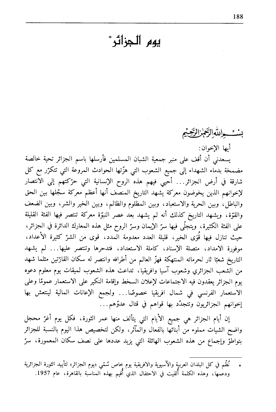 * نُظّم في كل البلدان العربية والآسيوية والافريقية يوم خاص سُمّي "يوم الجزائر" لتأييد الثورة الجزائرية ودعمها، وهذه الكلمة أُلقيت في الاحتفال الذي أُقيم بهذه المناسبة بالقاهرة، عام 1957.