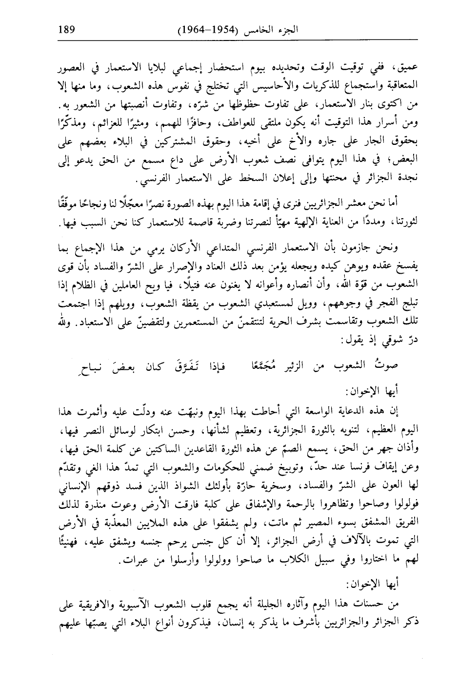 أما نحن معشر الجزائريين فنرى في إقامة هذا اليوم بهذه الصورة نصرًا معجّلًا لنا ونجاحًا موفّقًا لثورتنا، ومددًا من العناية الإلهية مهيّأ لنصرتنا وضربة قاصمة للاستعمار كنا نحن السبب فيها.