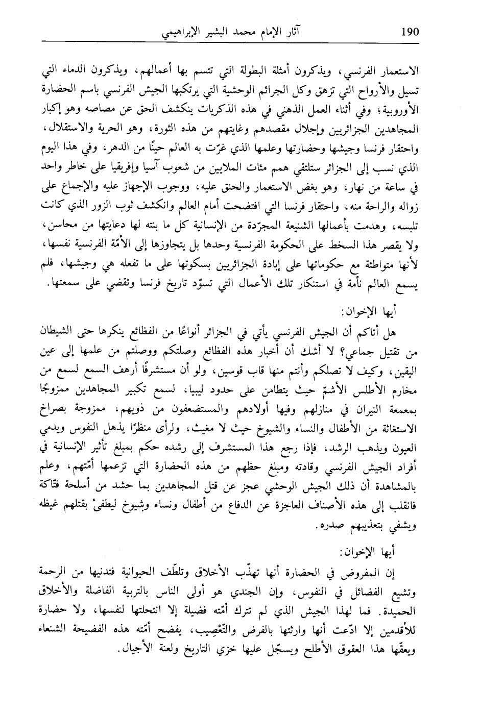 الاستعمار الفرنسي، ويذكرون أمثلة البطولة التي تتسم بها أعمالهم، ويذكرون الدماء التي تسيل والأرواح التي تزهق وكل الجرائم الوحشية التي يرتكبها الجيش الفرنسي باسم الحضارة الأوروبية، وفي أثناء العمل الذهني في هذه الذكريات ينكشف الحق عن مصاصه وهو إكبار المجاهدين الجزائريين وإجلال مقصدهم وغايتهم من هذه الثورة، وهو الحرية والاستقلال، واحتقار فرنسا وجيشها وحضارتها وعلمها الذي غرّت به العالم حينًا من الدهر، وفي هذا اليوم الذي نسب إلى الجزائر ستلتقي همم مئات الملايين من شعوب آسيا وإفريقيا على خاطر واحد في ساعة من نهار، وهو بغض الاستعمار والحنق عليه، ووجوب الإجهاز عليه والإجماع على زواله والراحة منه، واحتقار فرنسا التي افتضحت أمام العالم وانكشف ثوب الزور الذي كانت تلبسه، وهدمت بأعمالها الشنيعة المجرّدة من الإنسانية كل ما بنته لها دعايتها من محاسن، ولا يقصر هذا السخط على الحكومة الفرنسية وحدها بل يتجاوزها إلى الأمّة الفرنسية نفسها، لأنها متواطئة مع حكوماتها على إبادة الجزائريين بسكوتها على ما تفعله هي وجيشها، فلم يسمع العالم نأمة في استنكار تلك الأعمال التي تسوّد تاريخ فرنسا وتقضي على سمعتها.