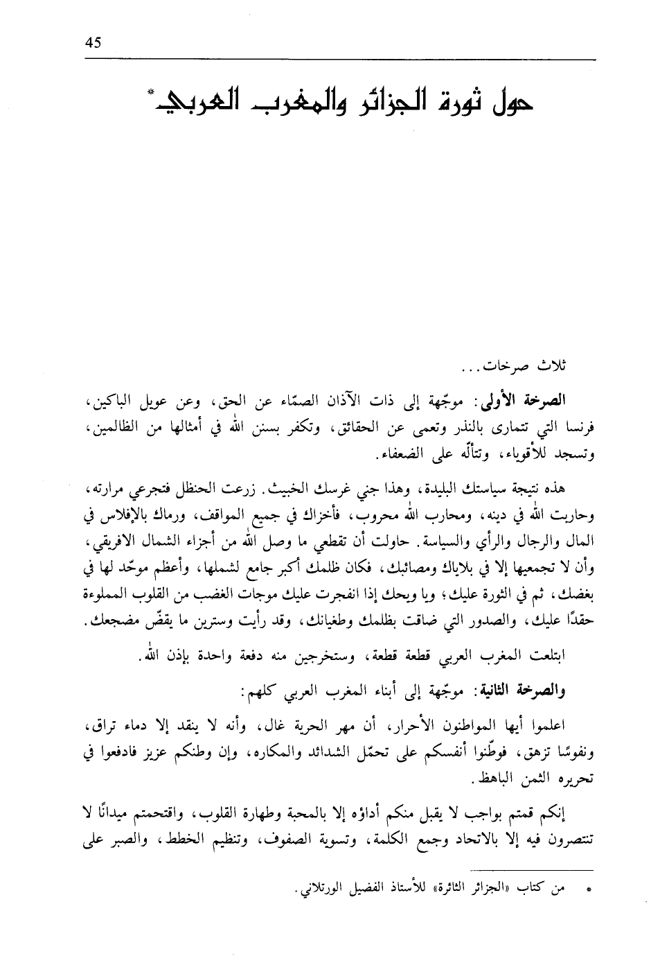 وـ[الصرخة الثانية]ـ: موجّهة إلى أبناء المغرب العربي كلهم: