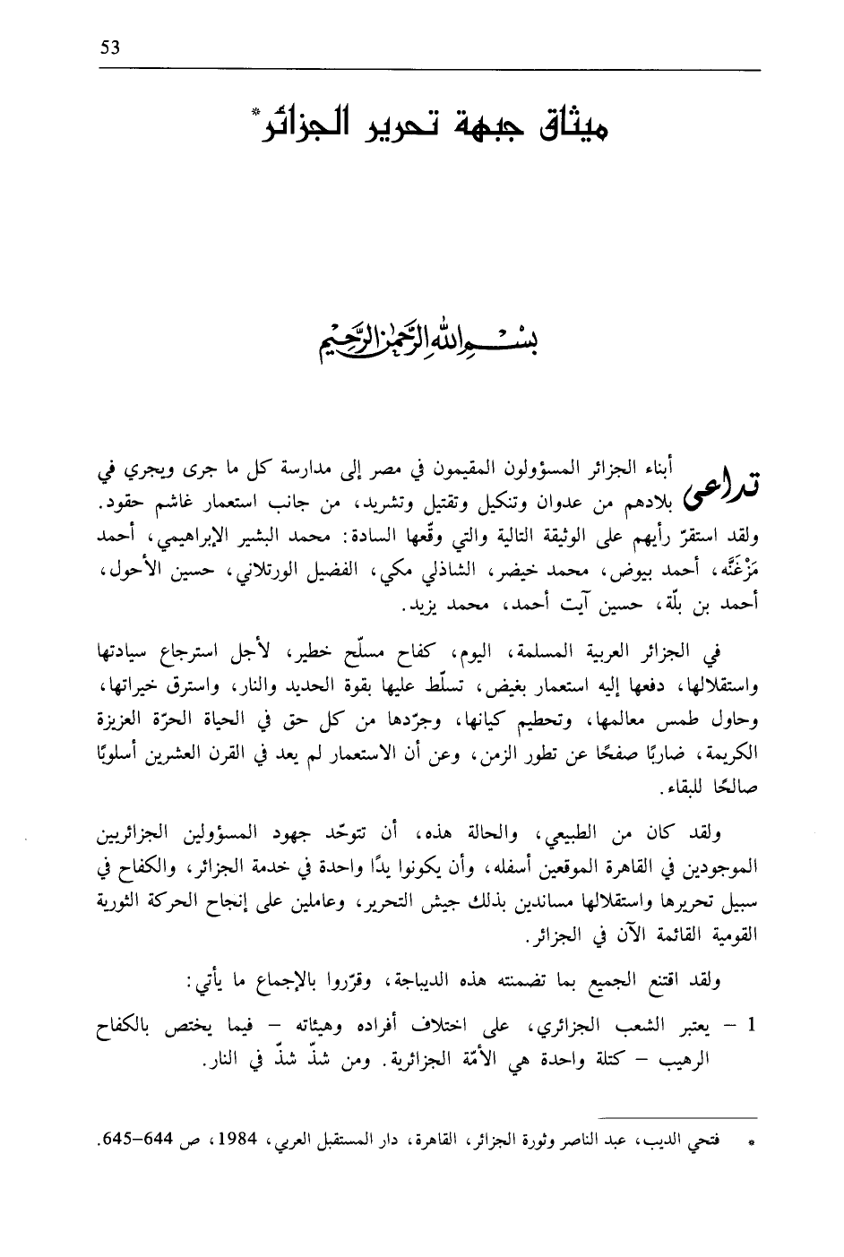 1 - يعتبر الشعب الجزائري، على اختلاف أفراده وهيئاته- فيما يختص بالكفاح الرهيب- كتلة واحدة هي الأمّة الجزائرية. ومن شذّ شذّ في النار.