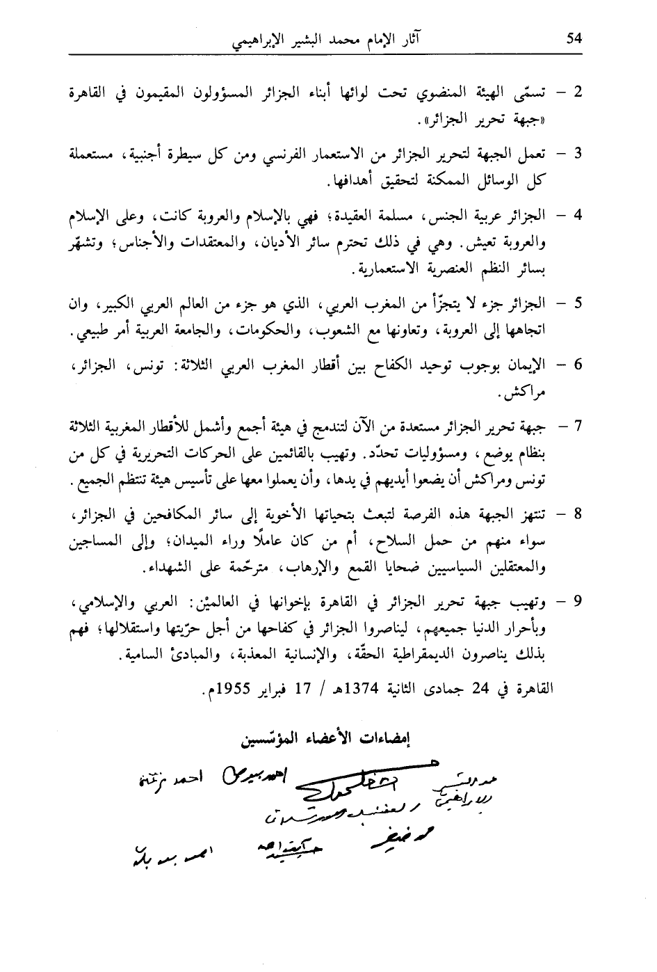 9 - وتهيب جبهة تحرير الجزائر في القاهرة بإخوانها في العالميْن: العربي والإسلامي، وبأحرار الدنيا جميعهم، ليناصروا الجزائر في كفاحها من أجل حرّيتها واستقلالها، فهم بذلك يناصرون الديمقراطية الحقّة، والإنسانية المعذبة، والمبادئ السامية.