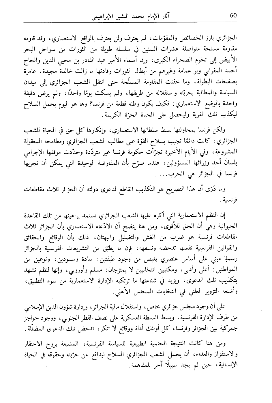الجزائري بارز الخصائص والمقوّمات، لم يعترف ولن يعترف بالواقع الاستعماري، وقد قاومه مقاومة مسلحة متواصلة عشرات السنين في سلسلة طويلة من الثورات من سواحل البحر الأبيض إلى تخوم الصحراء الكبرى، وإن أسماء الأمير عبد القادر بن محيي الدين والحاج أحمد المقراني وبو عمامة وغيرهم من أبطال الثورات وقادتها ما زالت خالدة مجيدة، عامرة بصفحات البطولة، وما خفتت المقاومة المسلّحة حتى انتقل الشعب الجزائري إلى ميدان السياسة والمطالبة بحريّته واستقلاله من طريقها، ولم يسكت يومًا واحدًا، ولم يرض دقيقة واحدة بالوضع الاستعماري: فكيف يكون وطنه قطعة من فرنسا؟ وها هو اليوم يحمل السلاح ليكذب تلك الفرية وليحصل على الحياة الحرّة الكريمة.
