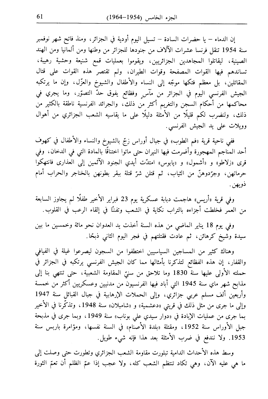وهناك كثير من المساجين السياسيين اختطفوا من السجون ليصرعوا غيلة في الفيافي والقفار، إن هذه الفظائع لتذكرنا بأمثالها مما كان الجيش الفرنسي يرتكبه في الجزائر في حملته الأولى عليها سنة 1830 وما تلاحق من سنيّ المقاومة الشعبية، حتى تنتهي بنا إلى مذابح شهر ماي سنة 1945 التي أباد فيها الفرنسيون من مدنيين وعسكريين أكثر من خمسة وأربعين ألف مسلم عربي جزائري، وإلى الحملات الإرهابية في جبال القبائل سنة 1947 وإلى ما جرى من مثل ذلك في قريتي "دعشمية" و "شامبلان" سنة 1948، وتذكّرنا في الأخير بما جرى من عمليات الإبادة في "دوار سيدي علي بوناب" سنة 1949، وبما جرى في مذبحة جبل الأوراس سنة 1952، ومقتلة "بلدة الأصنام" في السنة نفسها، ومؤامرة باريس سنة 1953. ولا نندفع في ضرب الأمثلة بعد هذا فإنه شيء طويل.