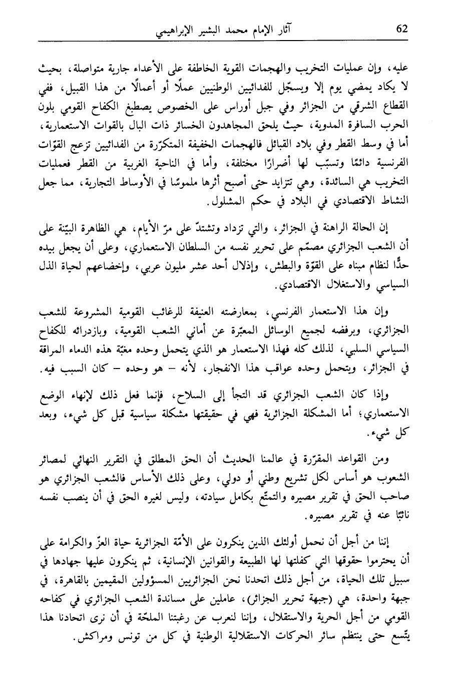 إن الحالة الراهنة في الجزائر، والتي تزداد وتشتدّ على مرّ الأيام، هي الظاهرة البيّنة على أن الشعب الجزائري مصمّم على تحرير نفسه من السلطان الاستعماري، وعلى أن يجعل بيده حدًّا لنظام مبناه على القوّة والبطش، وإذلال أحد عشر مليون عربي، وإخضاعهم لحياة الذل السياسي والاستغلال الاقتصادي.