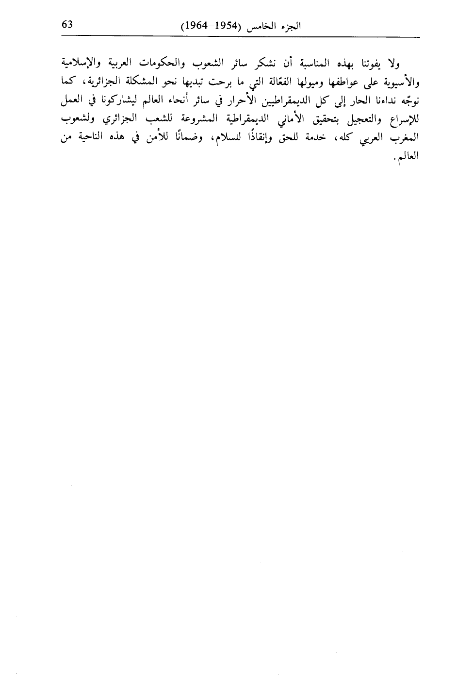 ولا يفوتنا بهذه المناسبة أن نشكر سائر الشعوب والحكومات العربية والإسلامية والأسيوية على عواطفها وميولها الفعّالة التي ما برحت تبديها نحو المشكلة الجزائرية، كما نوجّه نداءنا الحار إلى كل الديمقراطيين الأحرار في سائر أنحاء العالم ليشاركونا في العمل للإسراع والتعجيل بتحقيق الأماني الديمقراطية المشروعة للشعب الجزائري ولشعوب المغرب العربي كله، خدمة للحق وإنقاذًا للسلام، وضمانًا للأمن في هذه الناحية من العالم.