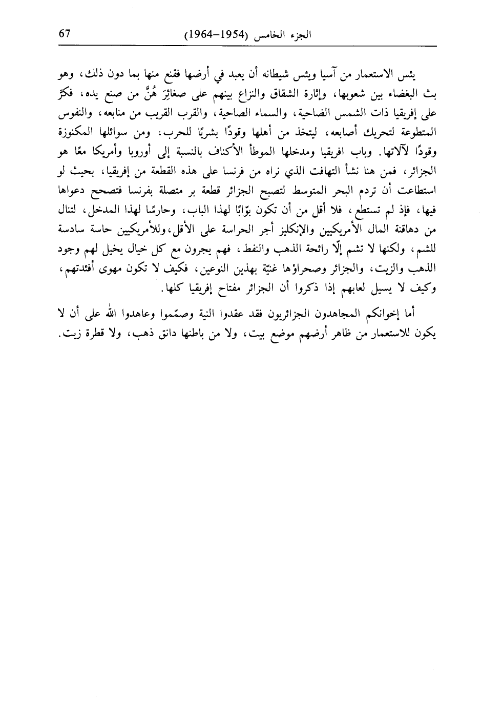 يئس الاستعمار من آسيا ويئس شيطانه أن يعبد في أرضها فقنع منها بما دون ذلك، وهو بث البغضاء بين شعوبها، وإثارة الشقاق والنزاع بينهم على صغائِرَ هُنَّ من صنع يده، فكرَّ على إفريقيا ذات الشمس الضاحية، والسماء الصاحية، والقرب القريب من منابعه، والنفوس المتطوعة لتحريك أصابعه، ليتخذ من أهلها وقودًا بشر للحرب، ومن سوائلها المكنوزة وقودًا لآلاتها. وباب افريقيا ومدخلها الموطأ الأكناف بالنسبة إلى أوروبا وأمريكا معًا هو الجزائر، فمن هنا نشأ التهافت الذي نراه من فرنسا على هذه القطعة من إفريقيا، بحيث لو استطاعت أن تردم البحر المتوسط لتصبح الجزائر قطعة بر متصلة بفرنسا فتصحح دعواها فيها، فإذ لم تستطع، فلا أقل من أن تكون بوّابًا لهذا الباب، وحارسًا لهذا المدخل، لتنال من دهاقنة المال الأمريكيين والإنكليز أجر الحراسة على الأقل، وللأمريكيين حاسة سادسة للشم، ولكنها لا تشم إلّا رائحة الذهب والنفط، فهم يجرون مع كل خيال يخيل لهم وجود الذهب والزيت، والجزائر وصحراؤها غنيّة بهذين النوعين، فكيف لا تكون مهوى أفئدتهم، وكيف لا يسيل لعابهم إذا ذكروا أن الجزائر مفتاح إفريقيا كلها.