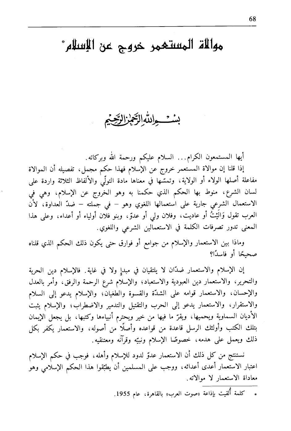 * كلمة أُلقيت بإذاعة "صوت العرب" بالقاهرة، عام 1955.