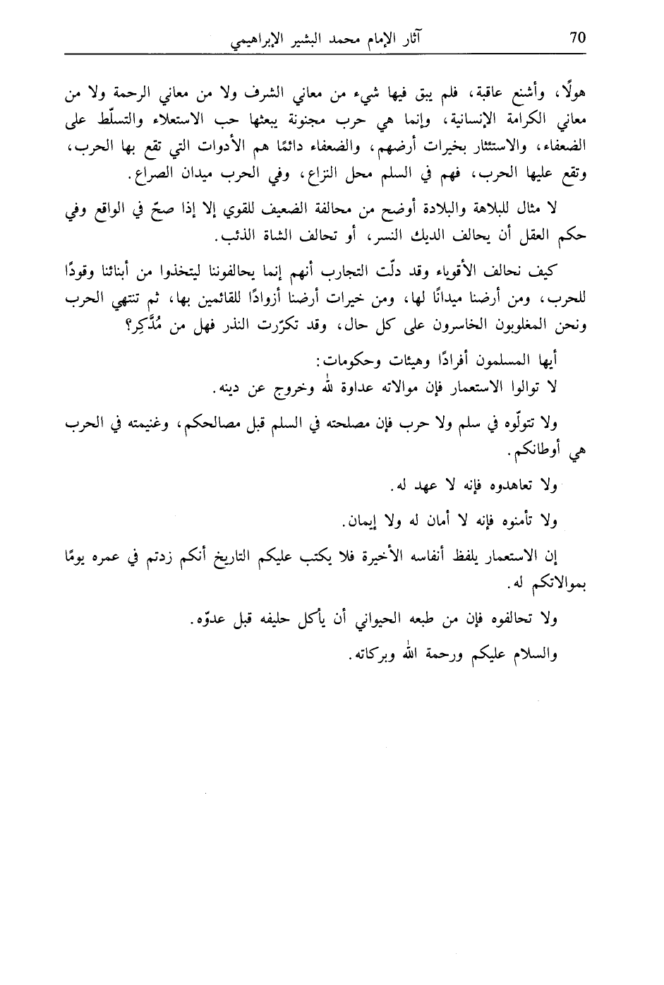 كيف نحالف الأقوياء وقد دلّت التجارب أنهم إنما يحالفوننا ليتخذوا من أبنائنا وقودًا للحرب، ومن أرضنا ميدانًا لها، ومن خيرات أرضنا أزوادًا للقائمين بها، ثم تنتهي الحرب ونحن المغلوبون الخاسرون على كل حال، وقد تكرّرت النذر فهل من مُدَّكِر؟