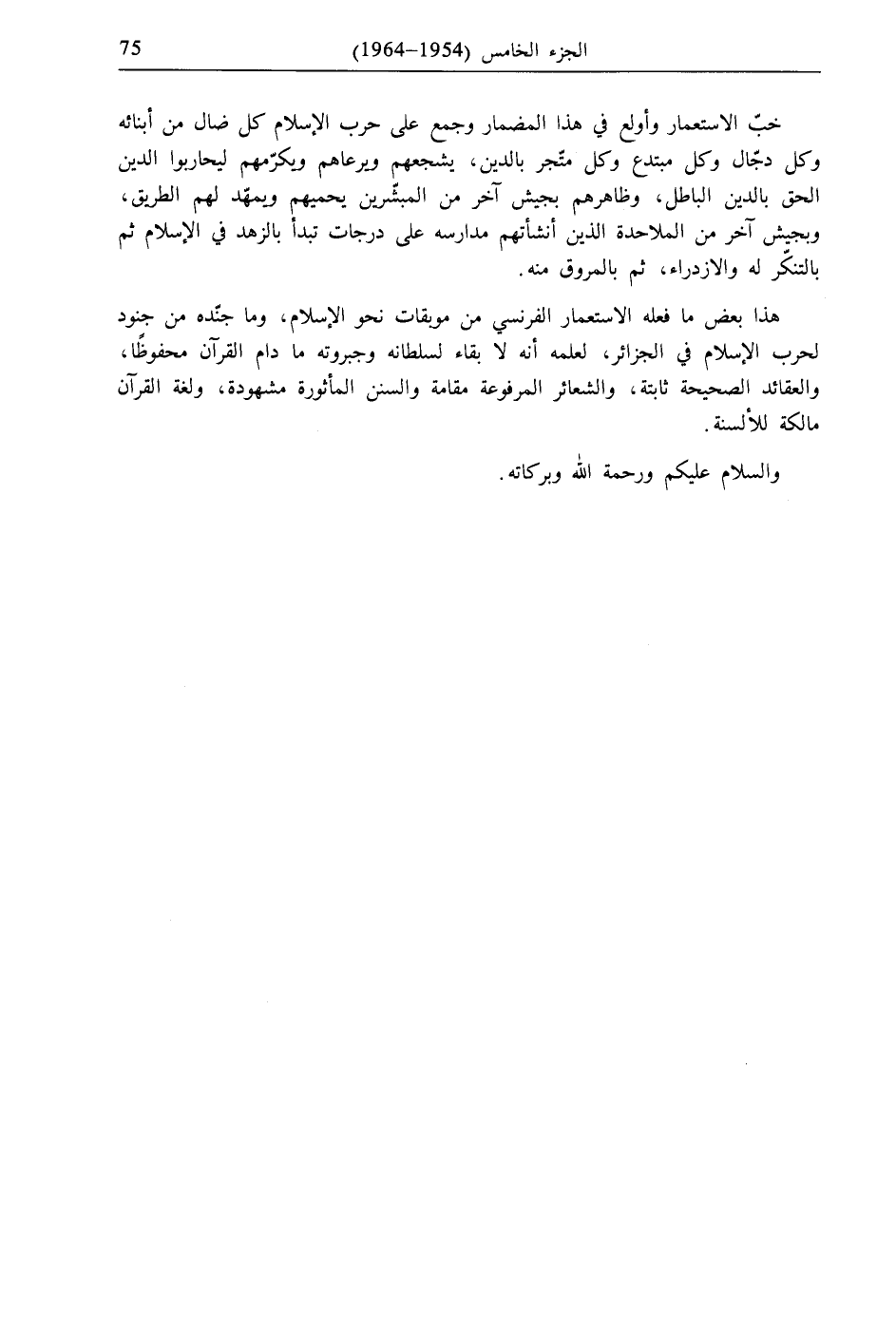 هذا بعض ما فعله الاستعمار الفرنسي من موبقات نحو الإسلام، وما جنّده من جنود لحرب الإسلام في الجزائر، لعلمه أنه لا بقاء لسلطانه وجبروته ما دام القرآن محفوظًا، والعقائد الصحيحة ثابتة، والشعائر المرفوعة مقامة والسنن المأثورة مشهودة، ولغة القرآن مالكة للألسنة.