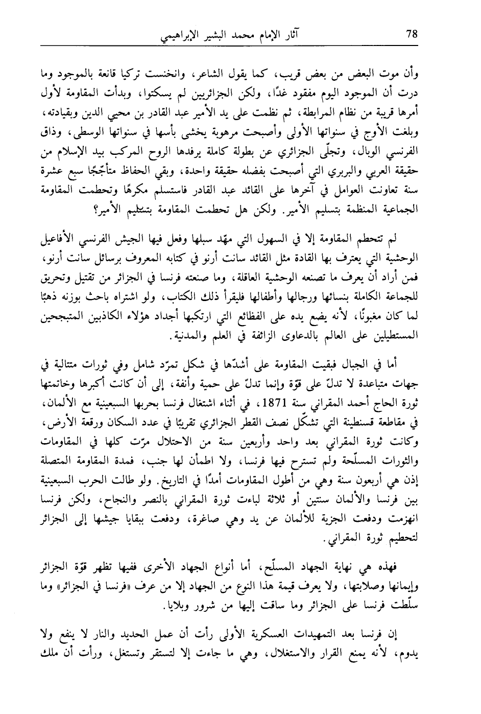 لم تتحطم المقاومة إلا في السهول التي مهّد سبلها وفعل فيها الجيش الفرنسي الأفاعيل الوحشية التي يعترف بها القادة مثل القائد سانت أرنو في كتابه المعروف برسائل سانت أرنو، فمن أراد أن يعرف ما تصنعه الوحشية العاقلة، وما صنعته فرنسا في الجزائر من تقتيل وتحريق للجماعة الكاملة بنسائها ورجالها وأطفالها فليقرأ ذلك الكتاب، ولو اشتراه باحث بوزنه ذهبًا لما كان مغبونًا، لأنه يضع يده على الفظائع التي ارتكبها أجداد هؤلاء الكاذبين المتبجحين المستطيلين على العالم بالدعاوى الزائفة في العلم والمدنية.