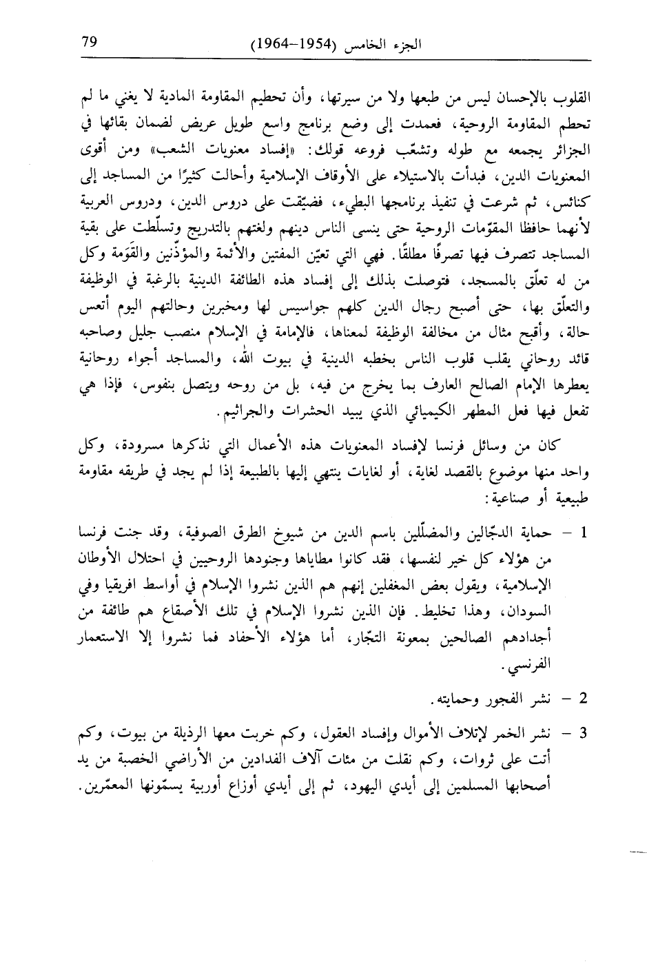 القلوب بالإحسان ليس من طبعها ولا من سيرتها، وأن تحطيم المقاومة المادية لا يغني ما لم تحطم المقاومة الروحية، فعمدت إلى وضع برنامج واسع طويل عريض لضمان بقائها في الجزائر يجمعه مع طوله وتشعّب فروعه قولك: "إفساد معنويات الشعب" ومن أقوى المعنويات الدين، فبدأت بالاستيلاء على الأوقاف الإسلامية وأحالت كثيرًا من المساجد إلى كنائس، ثم شرعت في تنفيذ برنامجها البطيء، فضيّقت على دروس الدين، ودروس العربية لأنهما حافظا المقوّمات الروحية حتى ينسى الناس دينهم ولغتهم بالتدريج وتسلّطت على بقية المساجد تتصرف فيها تصرفًا مطلقًا. فهي التي تعيّن المفتين والأئمة والمؤذّنين والقَوَمة وكل من له تعلّق بالمسجد، فتوصلت بذلك إلى إفساد هذه الطائفة الدينية بالرغبة في الوظيفة والتعلّق بها، حتى أصبح رجال الدين كلهم جواسيس لها ومخبرين وحالتهم اليوم أتعس حالة، وأقبح مثال من مخالفة الوظيفة لمعناها، فالإمامة في الإسلام منصب جليل وصاحبه قائد روحاني يقلب قلوب الناس بخطبه الدينية في بيوت الله، والمساجد أجواء روحانية يعطرها الإمام الصالح العارف بما يخرج من فيه، بل من روحه ويتصل بنفوس، فإذا هي تفعل فيها فعل المطهر الكيميائي الذي يبيد الحشرات والجراثيم.