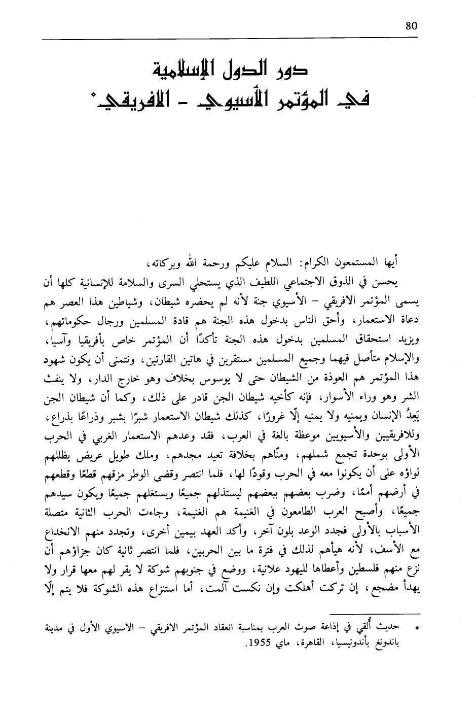 * حديث أُلقي في إذاعة صوت العرب بمناسبة انعقاد المؤتمر الافريقي- الاسيوي الأول في مدينة باندونغ بأندونيسيا، القاهرة، ماي 1955.
