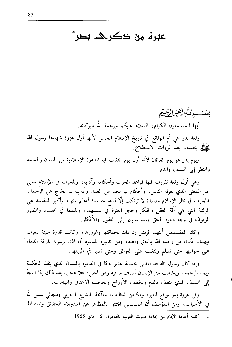 * كلمة ألقاها الإمام من إذاعة صوت العرب بالقاهرة، 15 ماي 1955.