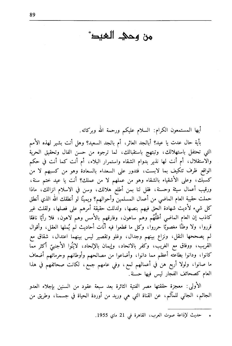* حديث لإذاعة صوت العرب، القاهرة في 21 ماي 1955.