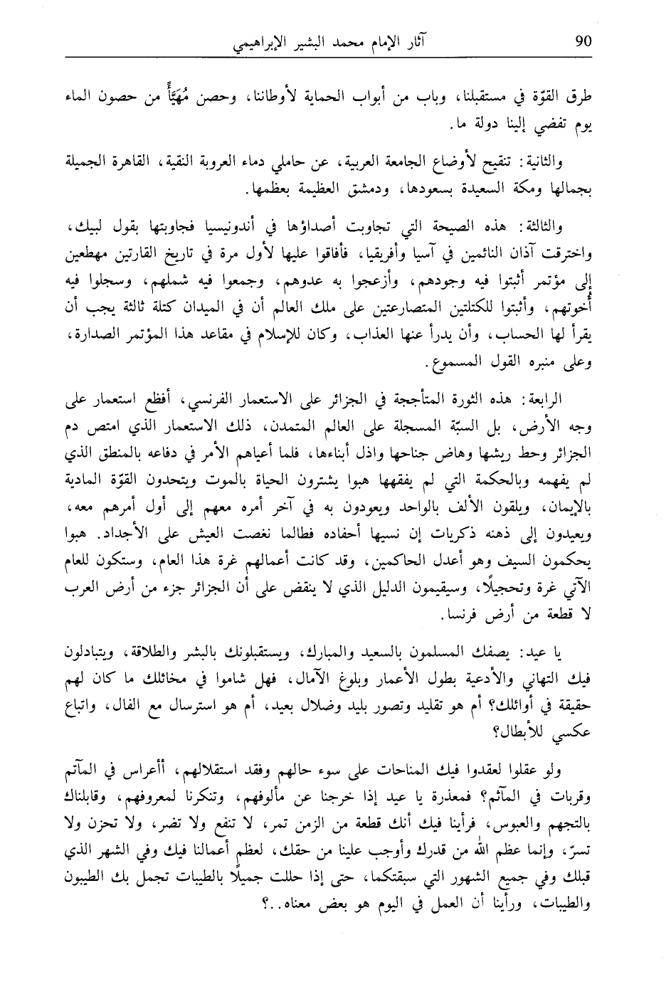 الرابعة: هذه الثورة المتأججة في الجزائر على الاستعمار الفرنسي، أفظع استعمار على وجه الأرض، بل السبّة المسجلة على العالم المتمدن، ذلك الاستعمار الذي امتص دم الجزائر وحط ريشها وهاض جناحها وأذل أبناءها، فلما أعياهم الأمر في دفاعه بالمنطق الذي لم يفهمه وبالحكمة التي لم يفقهها هبوا يشترون الحياة بالموت ويتحدون القوّة المادية بالإيمان، ويلقون الألف بالواحد ويعودون به في آخر أمره معهم إلى أول أمرهم معه، ويعيدون إلى ذهنه ذكريات إن نسيها أحفاده فطالما نغصت العيش على الأجداد. هبوا يحكمون السيف وهو أعدل الحاكمين، وقد كانت أعمالهم غرة هذا العام، وستكون للعام الآتي غرة وتحجيلًا، وسيقيمون الدليل الذي لا ينقض على أن الجزائر جزء من أرض العرب لا قطعة من أرض فرنسا.