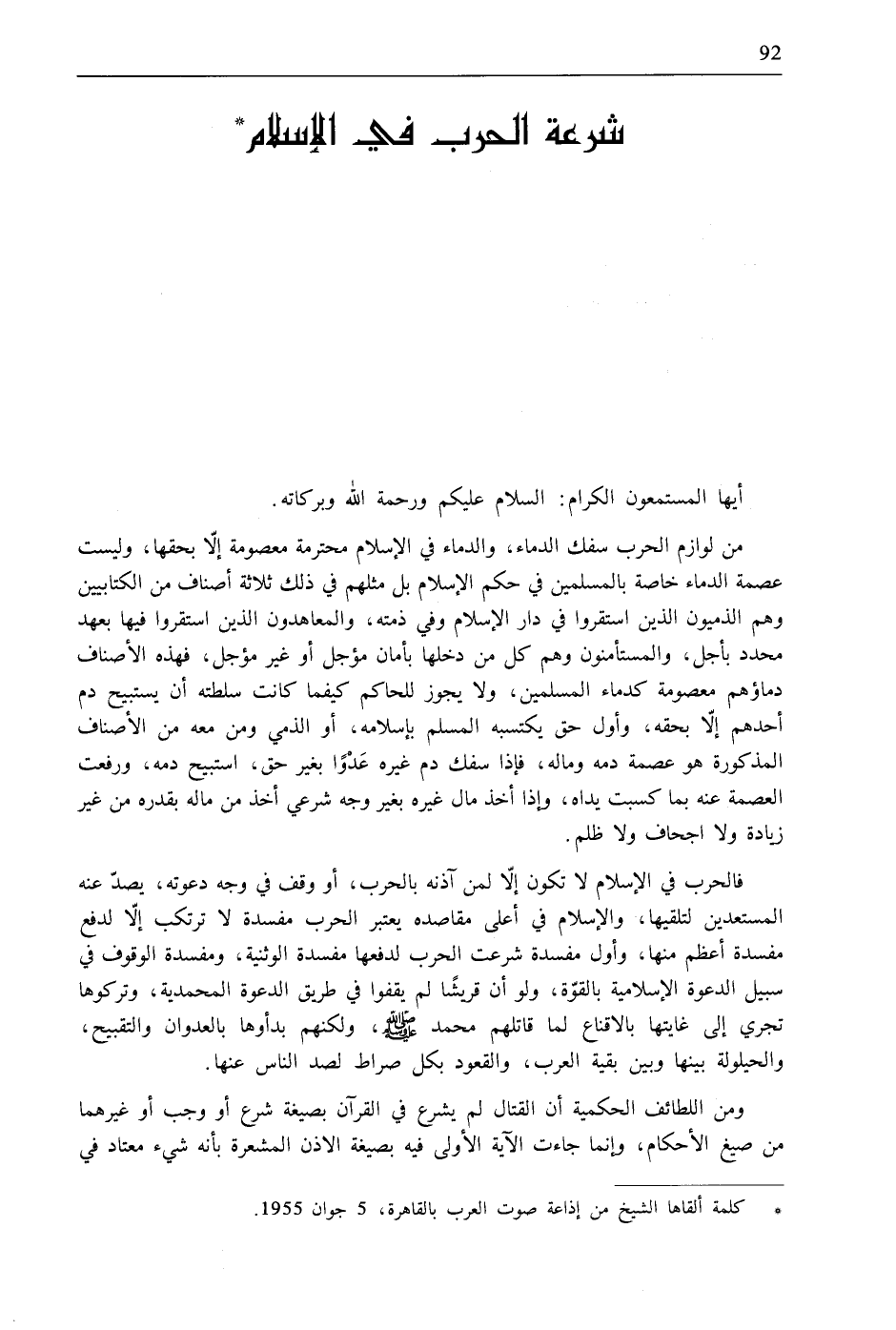 * كلمة ألقاها الشيخ من إذاعة صوت العرب بالقاهرة، 5 جوان 1955.