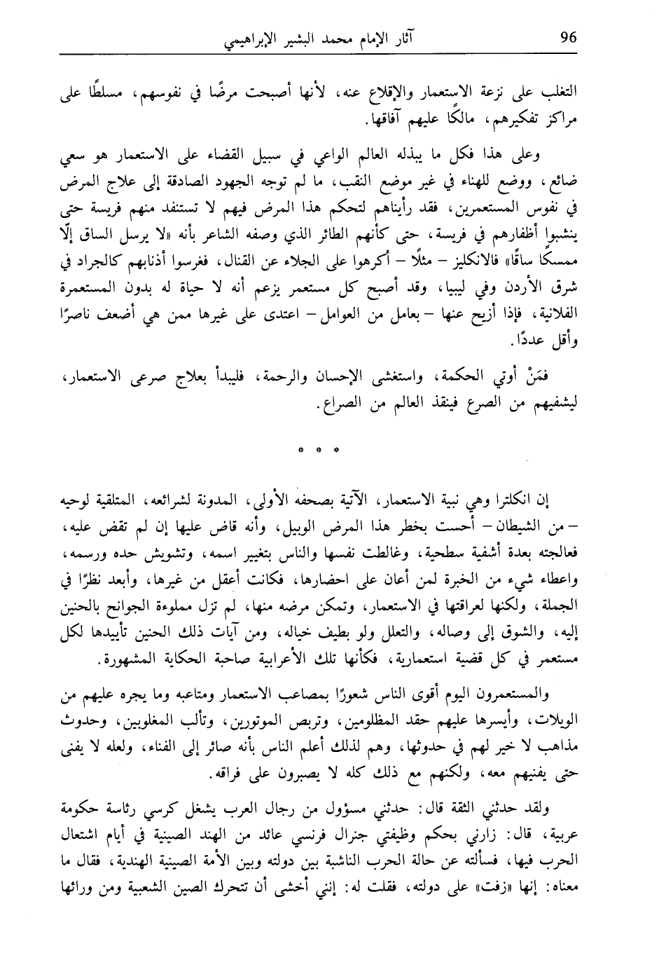 إن انكلترا وهي نبية الاستعمار، الآتية بصحفه الأولى، المدونة لشرائعه، المتلقية لوحيه - من الشيطان- أحست بخطر هذا المرض الوبيل، وأنه قاض عليها إن لم تقض عليه، فعالجته بعدة أشفية سطحية، وغالطت نفسها والناس بتغيير اسمه، وتشويش حده ورسمه، وإعطاء شيء من الخبرة لمن أعان على إحضارها، فكانت أعقل من غيرها، وأبعد نظرًا في الجملة، ولكنها لعراقتها في الاستعمار، وتمكن مرضه منها، لم تزل مملوءة الجوانح بالحنين إليه، والشوق إلى وصاله، والتعلل ولو بطيف خياله، ومن آيات ذلك الحنين تأييدها لكل مستعمر في كل قضية استعمارية، فكأنها تلك الأعرابية صاحبة الحكاية المشهورة.