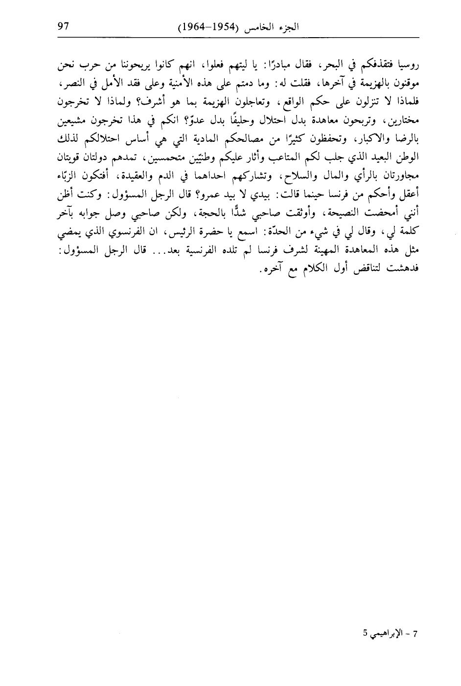 روسيا فتقذفكم في البحر، فقال مبادرًا: يا ليتهم فعلوا، إنهم كانوا يريحوننا من حرب نحن موقنون بالهزيمة في آخرها، فقلت له: وما دمتم على هذه الأمنية وعلى فقد الأمل في النصر، فلماذا لا تنزلون على حكم الواقع، وتعاجلون الهزيمة بما هو أشرف؟ ولماذا لا تخرجون مختارين، وتربحون معاهدة بدل احتلال وحليفًا بدل عدوّ؟ إنكم في هذا تخرجون مشيعين بالرضا والإكبار، وتحفظون كثيرًا من مصالحكم المادية التي هي أساس احتلالكم لذلك الوطن البعيد الذي جلب لكم المتاعب وأثار عليكم وطنيّين متحمسين، تمدهم دولتان قويتان مجاورتان بالرأي والمال والسلاح، وتشاركهم إحداهما في الدم والعقيدة، أفتكون الزبّاء أعقل وأحكم من فرنسا حينما قالت: بيدي لا بيد عمرو؟ قال الرجل المسؤول: وكنت أظن أنني أمحضت النصيحة، وأوثقت صاحبي شدًّا بالحجة، ولكن صاحبي وصل جوابه بآخر كلمة لي، وقال لي في شيء من الحدّة: اسمع يا حضرة الرئيس، إن الفرنسوي الذي يمضي مثل هذه المعاهدة المهينة لشرف فرنسا لم تلده الفرنسية بعد ... قال الرجل المسؤول: فدهشت لتناقض أول الكلام مع آخره.