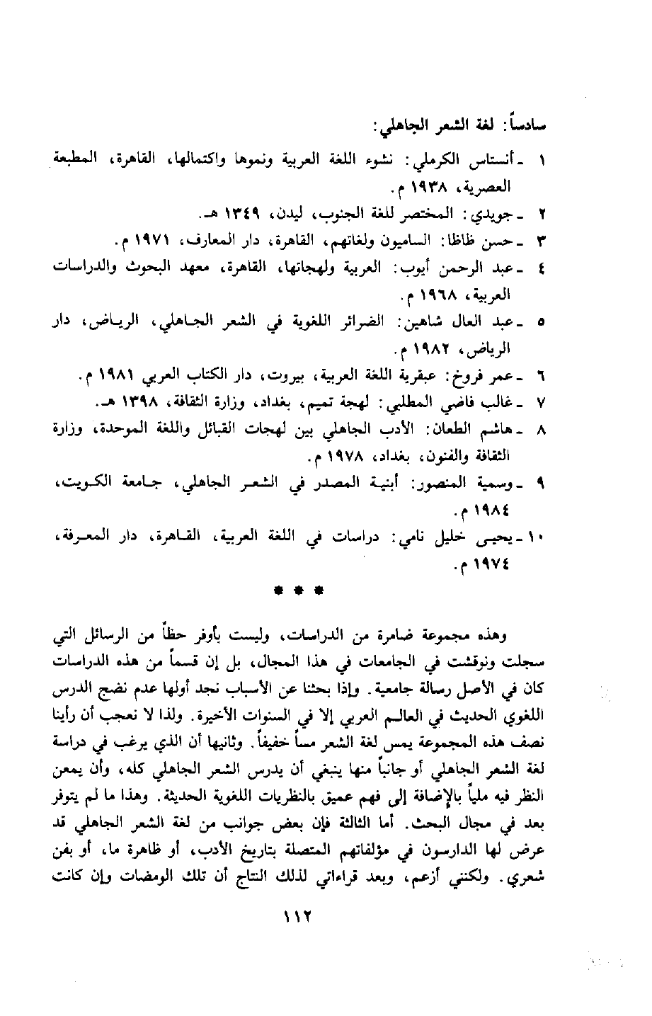 وهذه مجموعة ضامرة من الدراسات، ليست بأوفر حظًّا من الرسائل التي سجَّلت ونوقشت في الجامعات في هذا المجال، بل إن قسمًا من هذه الدراسات كان في الأصل رسالة جامعية، وإذا بحثنا عن الأسباب نجد أولها عدم نضج الدرس اللغوي الحديث في العالم العربي إلّا في السنوات الأخيرة, ولذا لا نعجب إن رأينا نصف هذه المجموعة يمس لغة الشعر مسًّا خفيفًا، وثانيها: أن الذي يرغب في دراسة لغة الشعر الجاهلي أو جانبًا منها ينبغي أن يدرس الشعر الجاهلي كله، وأن يمعن النظر فيه مليًّا, بالإضافة إلى فهم عميق بالنظريات اللغوية الحديثة، وهذا ما لم يتوفر بعد في مجال البحث، أما الثالثة: فإن بعض جوانب من لغة الشعر الجاهلي قد عرض لها الدراسون في مؤلفاتهم المتصلة بتاريخ الأدب، أو ظاهرة ما، أو بفن شعري، ولكنني أزعم، وبعد قرائتي لذلك النتاج أن تلك الومضات وإن كانت نافعة في ذلك المجال, لكنها لسيت من الدراسات اللغوية التي تكشف عن خصائص الشعر الجاهلي، إن الشعر الجاهلي ينتظر من الباحثين الكثير في هذا المجال لنقف على طبيعة العلاقات اللغوية والتراكيب وقاموس الشاعر اللغوي والبنى اللغوية, وغير ذلك مما يخدم الشعر واللغة والبحث العلمي.
