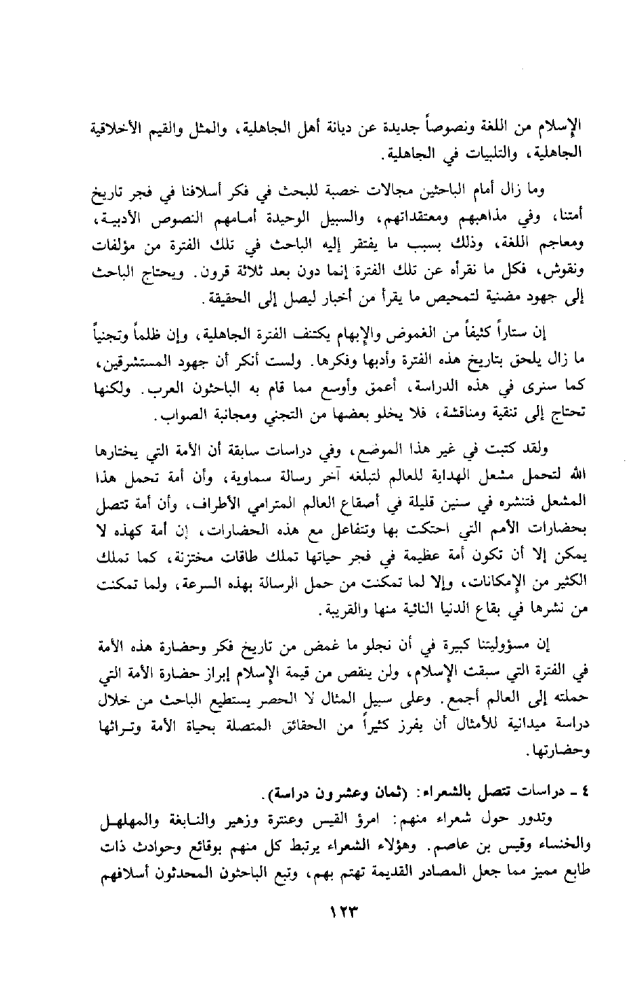 إن ستارًا كثيفًا من الغموض والإبهام يكتنف الفترة الجاهلية، وإن ظلمًا وتجنيًّا ما زال يحلق بتاريخ هذه الفترة وأدبها وفكرها، ولست أنكر أن جهود المستشرقين، كما سنرى في هذه الدراسة، أعمق وأوسع مما قام به الباحثون العرب، ولكنها تحتاج إلى تنقية ومناقشة، فلا يخلو بعضها من التجنّي ومجانبة الصواب.