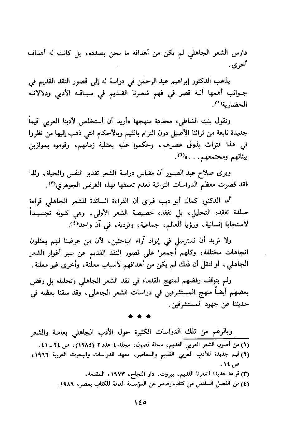 ولا نريد أن نسترسل في إيراد آراء الباحثين؛ لأن من عرضنا لهم يمثلون اتجاهات مختلفة، وكلهم أجمعوا على قصور النقد القديم عن سبر أغوار الشعر الجاهلي، أو لنقل: إن ذلك لم يكن من أهدافهم لأسباب معلنة، وأخرى غير معلنة.