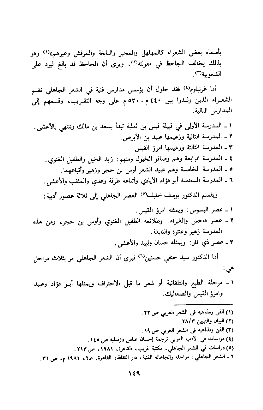 أما غرنباوم4 فقد حاول أن يؤسس مدارس فنية في الشعر الجاهلي تضم الشعراء الذين ولدوا بين 440م -530م على وجه التقريب، وقسَّمهم إلى المدارس التالية: