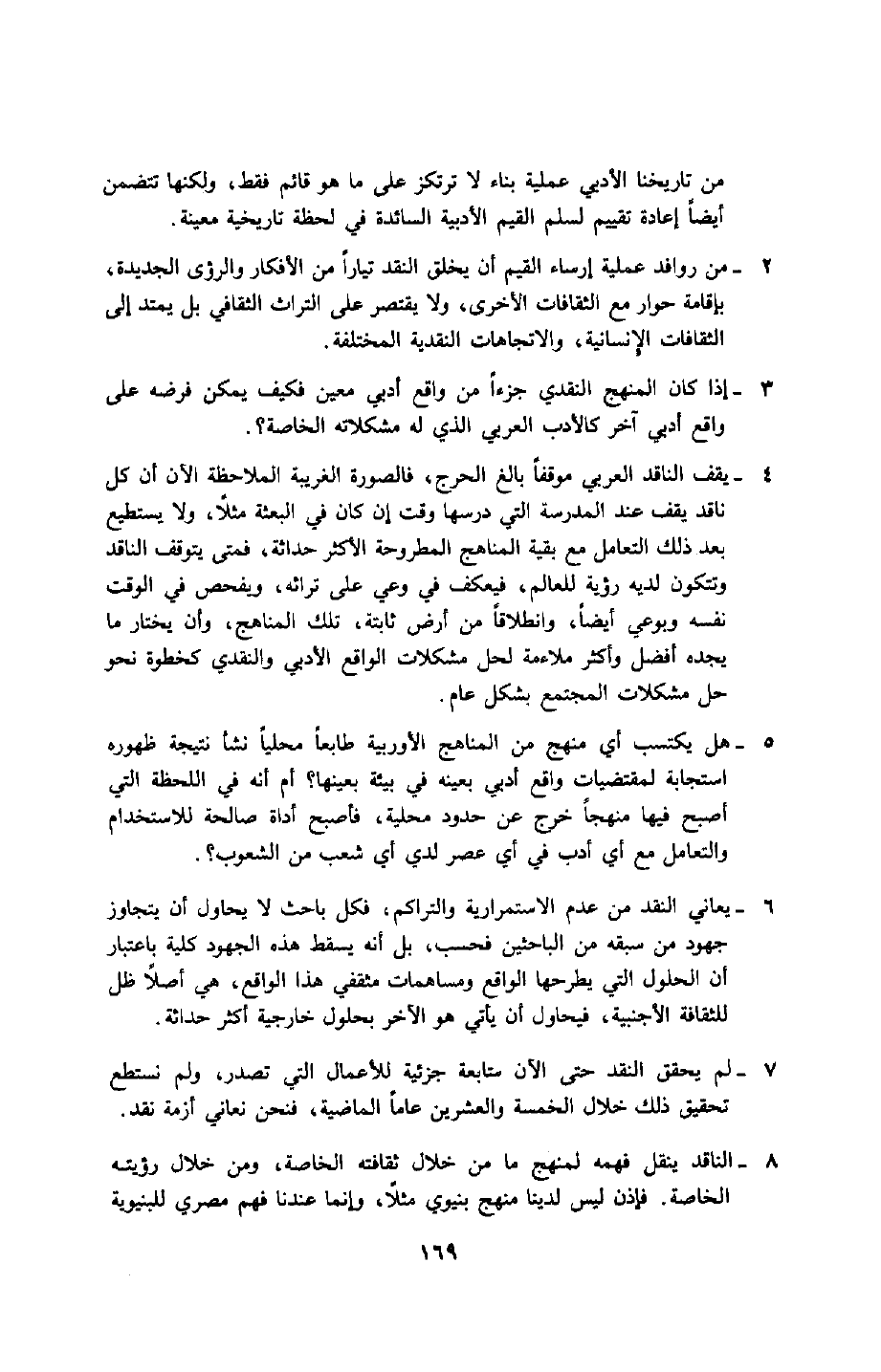 8- الناقد ينقل فهمه لمنهجٍِ ما من خلال ثقافته الخاصة، ومن خلال رؤيته الخاصة, فإذن ليس لدينا منهج بنيوي مثلًا، وإنما عندنا فهم مصري للبنيوية