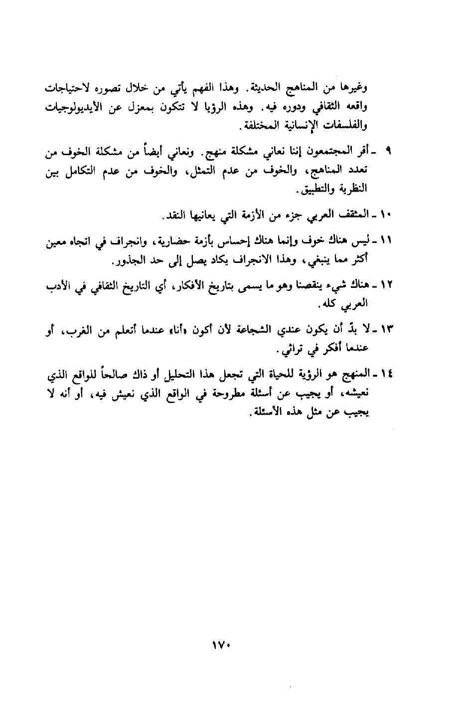 14- المنهج هو الرؤية للحياة التي تجعل هذا التحلل أو ذاك صالحًا للواقع الذي نعيشه، أو يجيب عن أسئلة مطروحة في الواقع الذي نعيش فيه، أو أنه لا يجيب عن مثل هذه الأسئلة.