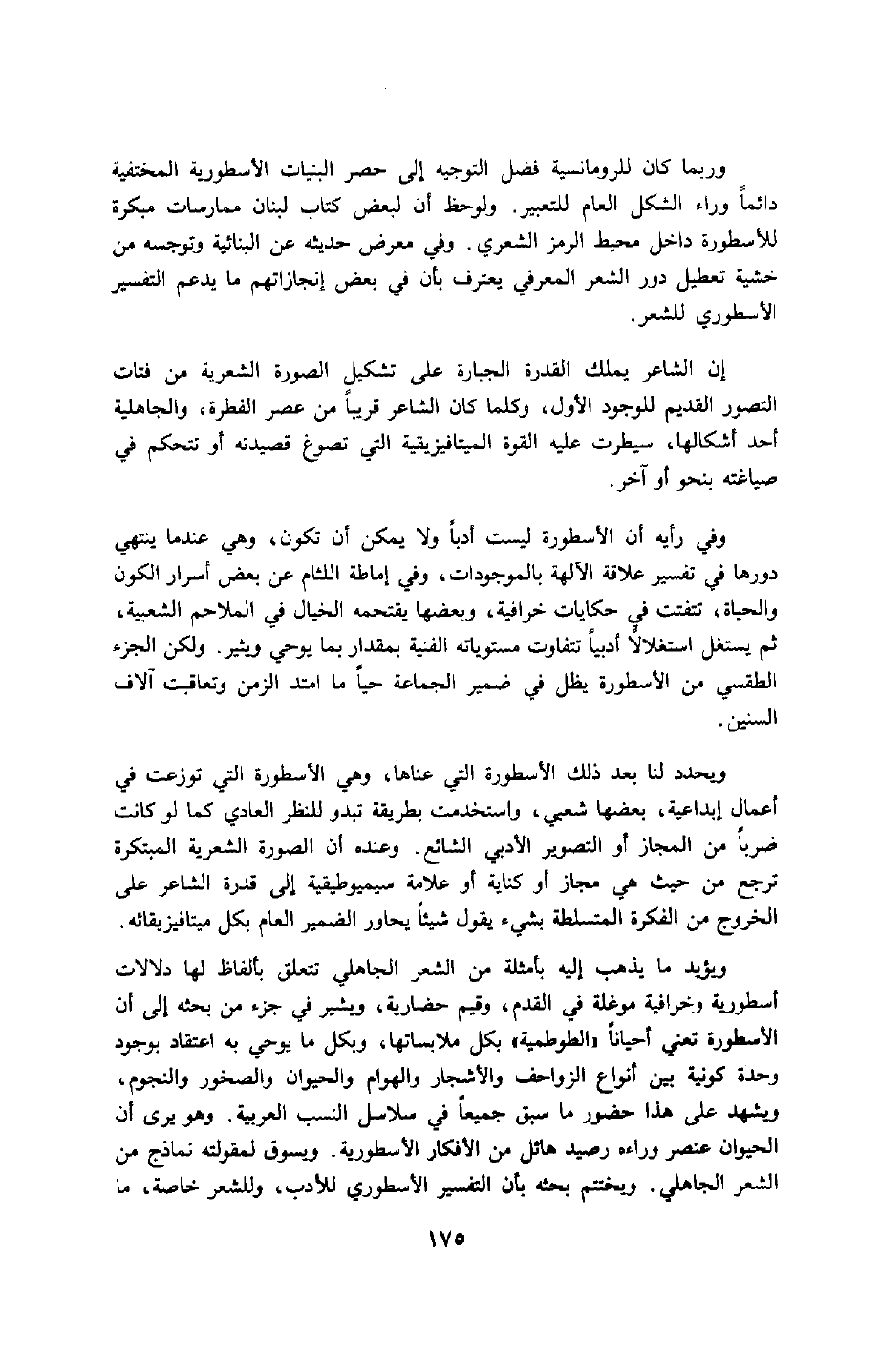 وربما كان للرومانسية فضل التوجيه إلى حصر البنيات الأسطورية والمختفية دائمًا وراء الشكل العام للتعبير. ولوحظ أن لبعض كُتّاب لبنان ممارسات مبكرة للأسطورة داخل محيط الرمز الشعري، وفي معرض حديثه عن البنائية وتوجسه من خشية تعطيل دور الشعر المعرفي, يعترف بأن في بعض إنجازاتهم ما يدعم التفسير الأسطوري للشعر.