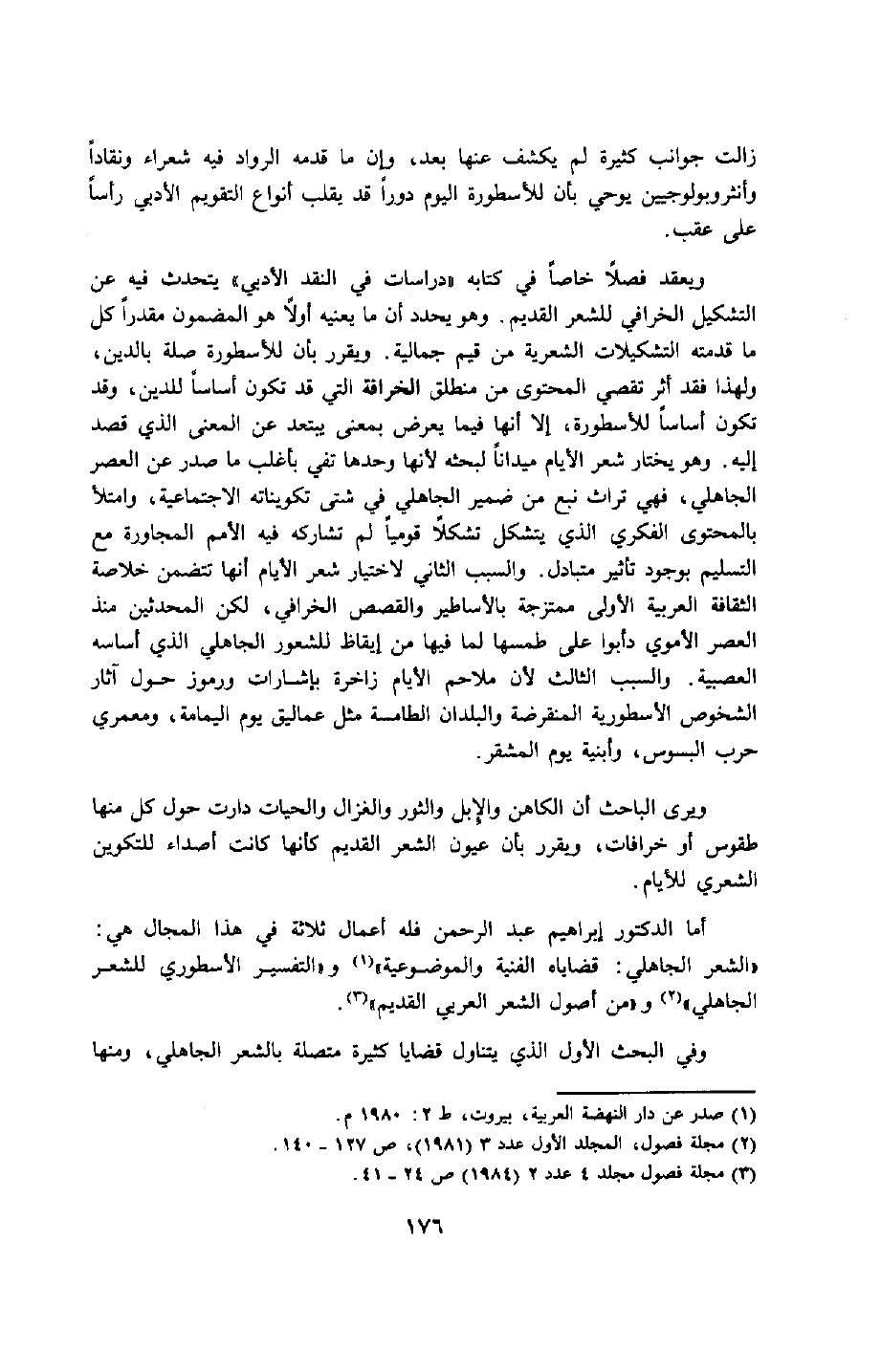 أما الدكتور إبراهيم عبد الرحمن فله أعمال ثلاثة في هذا المجال هي: "الشعر الجاهلي: قضاياه الفنية والموضعية"1 و"التفسير الأسطوري للشعر الجاهلي"2 و"من أصول الشعر العربي القديم"3.
