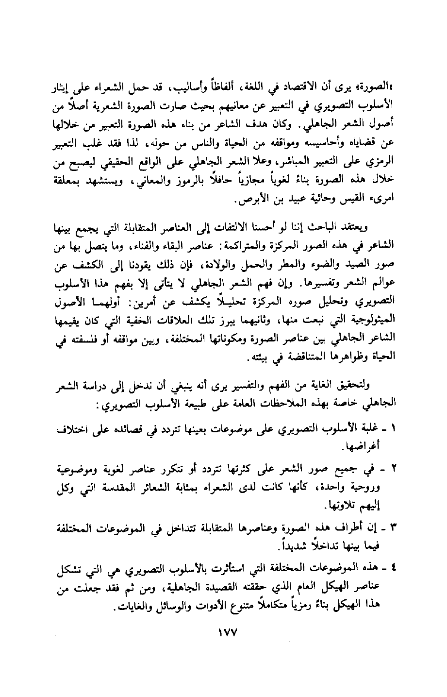 4- هذه الموضوعات المختلفة التي استأثرت بالأسلوب التصويري هي التي تشكِّل عناصر الهيكل العام الذي حققته القصيدة الجاهلية، ومن ثَمَّ فقد جعلت من هذا الهيكل بناءً رمزيًّا متكاملًا متنوع الأدوات والوسائل والغايات.