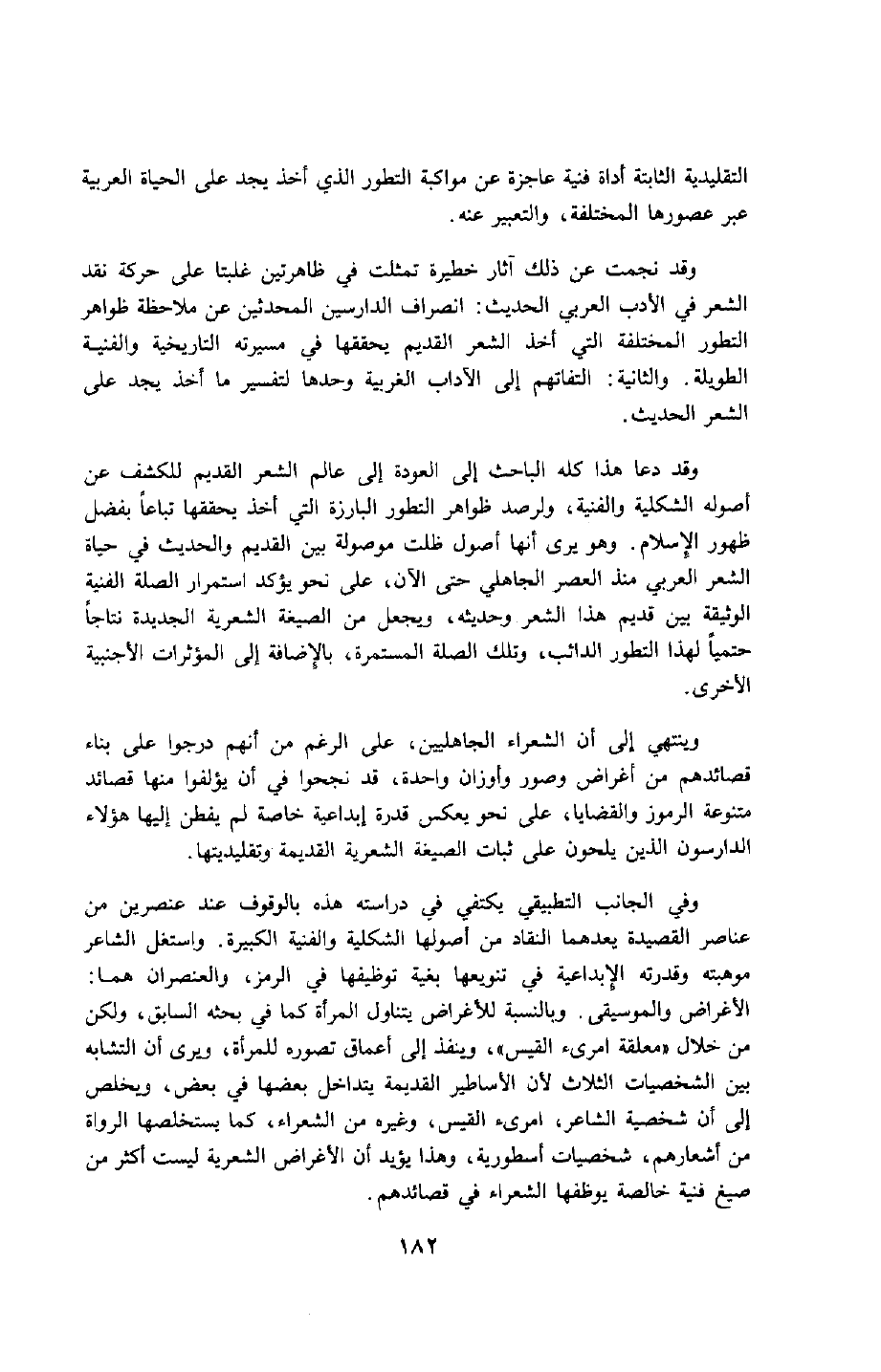 وقد دعا هذا كله الباحث إلى العودة إلى عالم الشعر القديم للكشف عن أصوله الشكلية والفنية، ولرصد ظواهر التطور البارزة التي أخذ يحققها تباعًا بفضل ظهور الإسلام، وهو يرى أنها أصول ظلت موصولة بين القديم والحديث في حياة الشعر العربي منذ العصر الجاهلي حتى الآن، على نحوٍ يؤكد استمرار الصلة الفنية الوثيقة بين قديم هذا الشعر وحديثه، ويجعل من الصيغة الشعرية الجديدة نتاجًا حتميًّا لهذا التطور الدائب، وتلك الصلة المستمرة، بالإضافة إلى المؤثرات الأجنبية الأخرى.