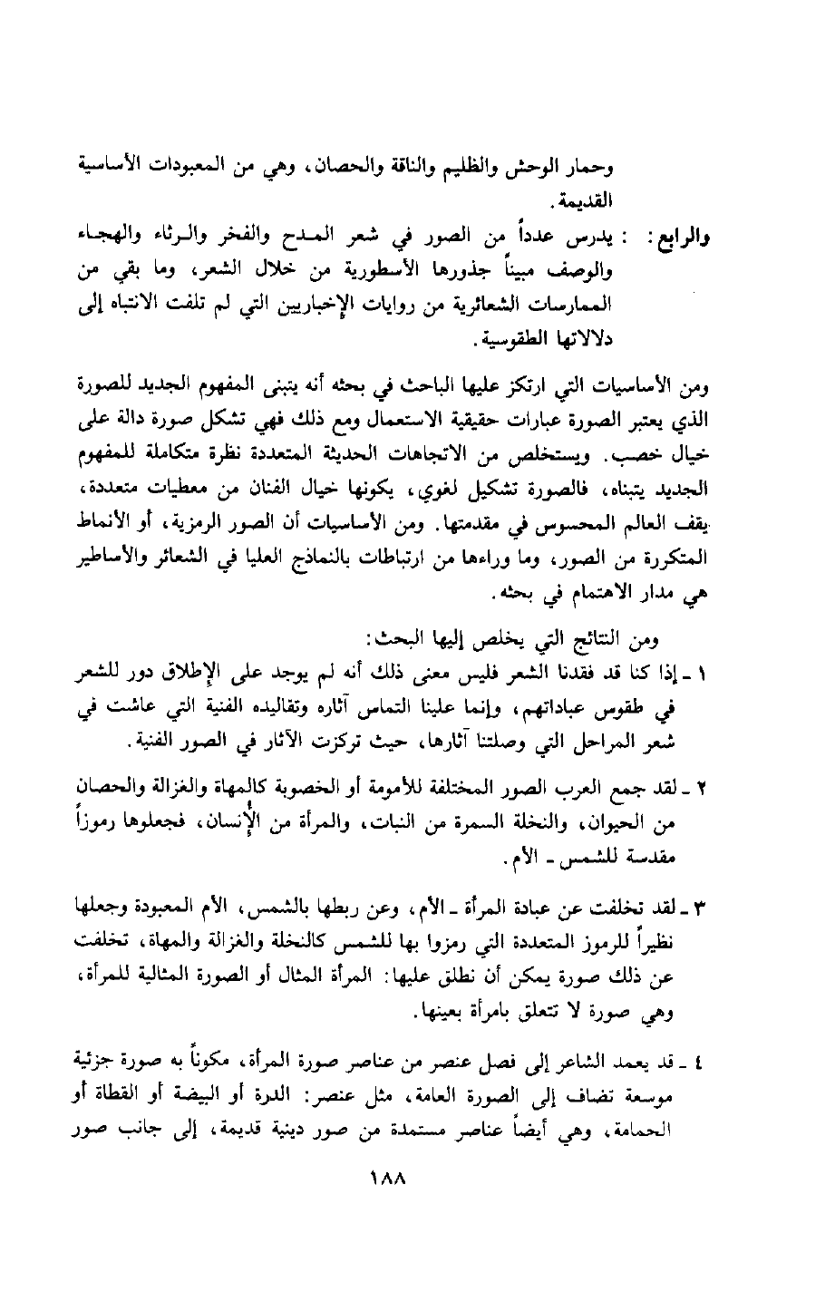 والرابع: يدرس عددًا من الصور في شعر المدح والفخر والرثاء والهجاء والوصف مبينًا جذورها الأسطورية من خلال الشعر، وما بقي من الممارسات الشعائرية من روايات الإخباريين التي لم تلفت الانتباه إلى دلالاتها الطقوسية.