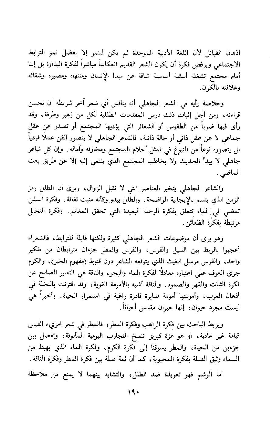 أذهان القبائل؛ لأن اللغة الأدبية الموحدة لم تكن لتنمو إلّا بفضل نمو الترابط الاجتماعي, ويرفض فكرة أن يكون الشعر القديم انعكاسًا مباشرًا لفكرة البداوة, بل إننا أمام مجتمع تشغله أسئلة أساسية شاقة عن مبدأ الإنسان ومنتهاه ومصيره وشقائه وعلاقته بالكون.