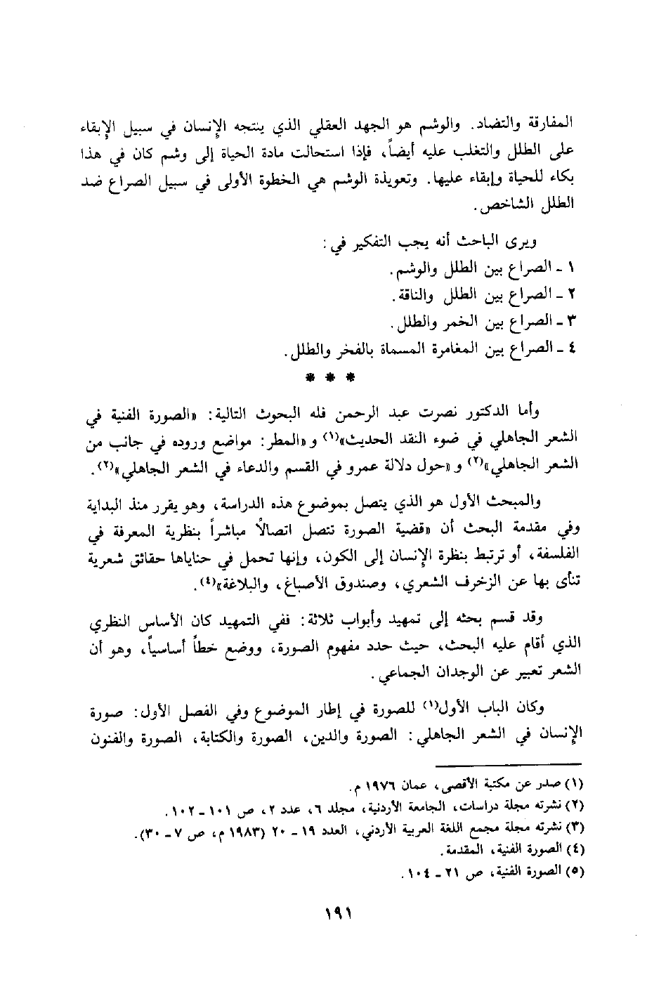 وكان الباب الأول1 للصورة في إطار الموضوع, وفي الفصل الأول: صورة الإنسان في الشعر الجاهلي: الصورة والدين، الصورة والكتابة، الصورة والفنون
