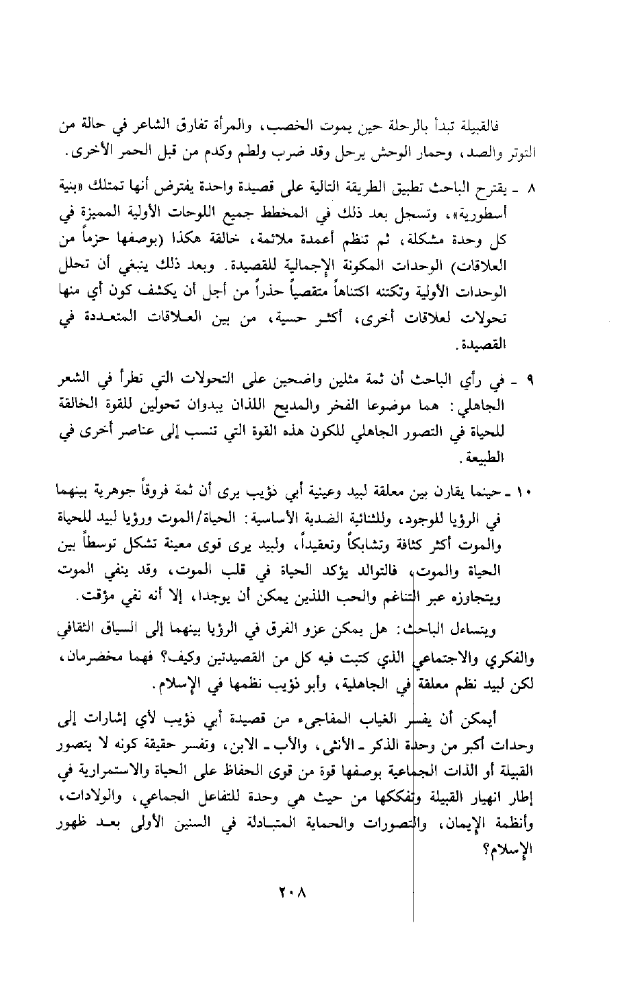 أيمكن أن يفسِّر الغياب المفاجئ من قصيدة أبي ذؤيب لأي إشارات إلى وحدات أكثر من وحدة الذكر -الأنثى, والأب - الابن، وتفسر حقيقة كونه لا يتصور القبيلة أو الذات الجماعية بوصفها قوة من قوى الحفاظ على الحياة, والاستمرارية في إطار انهيار القبيلة وتفككها من حيث هي وحدة للتفاعل الجماعي، والولادات، وأنظمة الإيمان، والتصورات, والحماية المتبادلة في السنين الأولى، بعد ظهور الإسلام؟