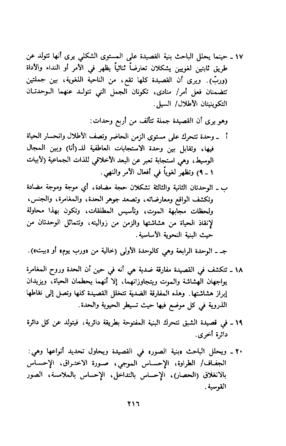17- حينما يحلل الباحث بنية القصيدة على المستوى الشكلي يرى أنها تتولّد عن طريق ثابتين لغويين يشكلان تعارضًا ثنائيًّا يظهر في الأمر أو النداء والأداة "وربَّ", ويرى أن القصيدة كلها تقع من الناحية اللغوية بين جملتين تتضمنان فعل أمر/ منادى، تكونان الجمل التي تتولد عنهما الوحدتان التكوينيتان الأطلال/ السيل.