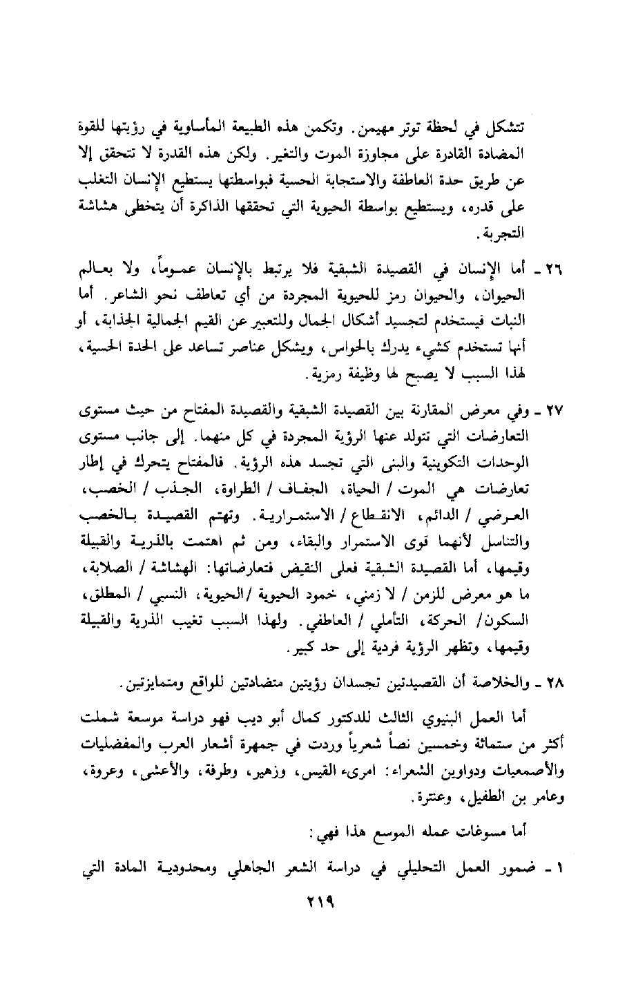 أما العمل البنيوي الثالث للدكتور كمال أبو ديب فهو دراسة موسَّعة شملت أكثر من ستمائة وخمسين نصًّا شعريًّا وردت في جمهرة أشعارة العرب والمفضليات والأصمعيات ودواوين الشعراء: امرئ القيس، وزهير، وطرفة، والأعشى، وعروة، وعامر بن الطفيل، وعنترة.