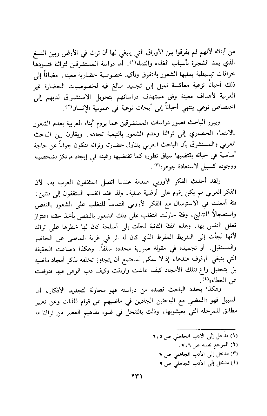 ويبرر الباحث قصور دراسات المستشرقين عمَّا يروم أبناء العربية بعدم الشعور بالانتماء الحضاري إلى تراثنا, وعدم الشعور بالتبعية تجاهه. ويقارن بين الباحث العربي والمستشرق بأن الباحث العربي يتناول حضارته وتراثه لتكون جوابًا عن حاجة أساسية في حياته يقتضيها سياق تطوره كما تقتضيها رغبته في إيجاد مرتكز لشخصيته ووجوده كسبيل لاستعادة جوهره3.