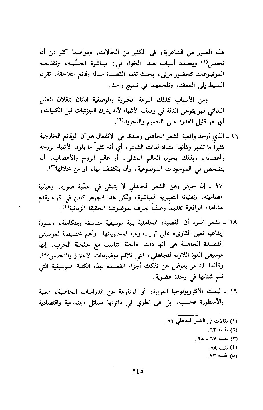17- إن جوهر وهن الشعر الجاهلي لا يتمثَّل في حسية صوره، وعيانية مضامينه، وتقنياته التعبيرية المباشرة، ولكن هذا الجوهر كامِن في كونه يقدِّم مشاهده الواقعية تقديمًا وصفيًّا يعترف بموضوعية الحقيقة الزمانية4.