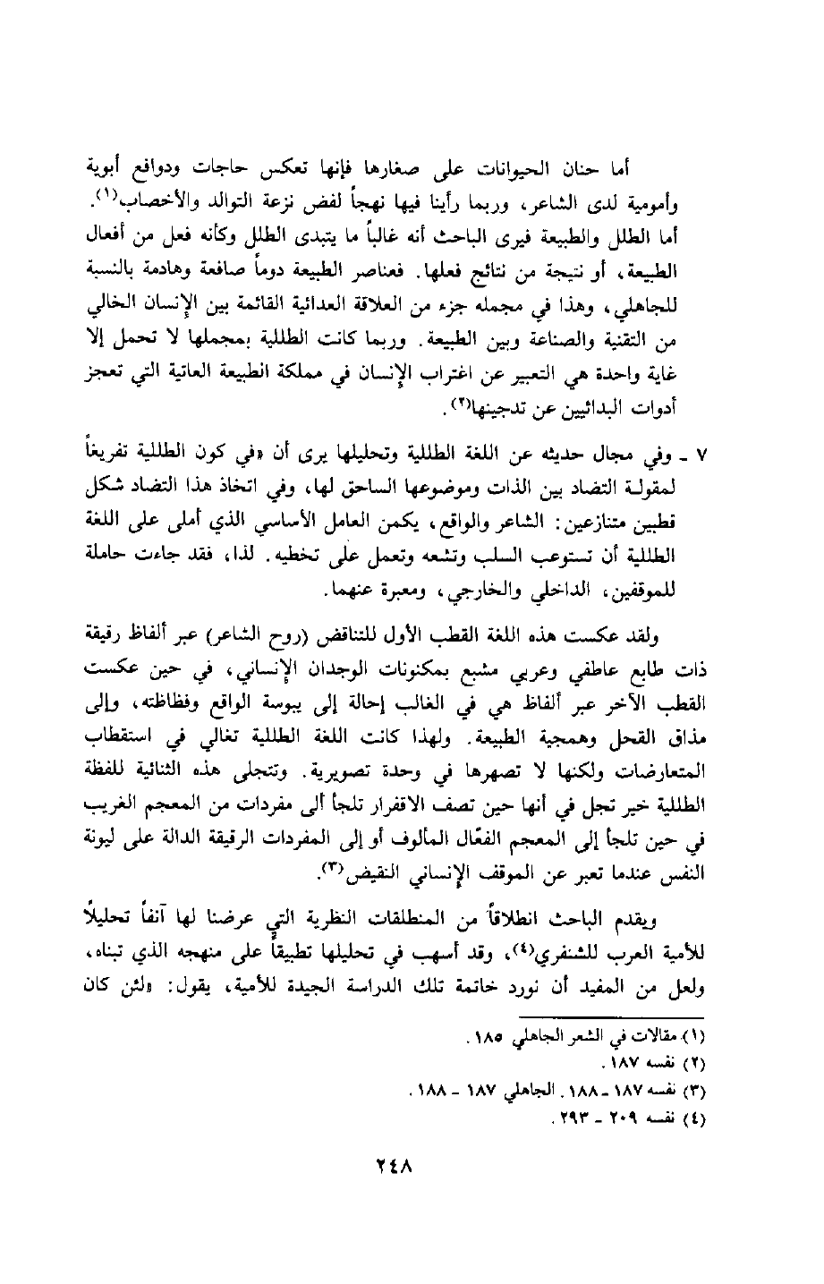 أما حنان الحيوانات على صغارها, فإنها تعكس حاجات ودوافع أبوية وأمومية لدى الشاعر، وربما رأينا فيها نهجًا لفض نزعة التوالد والإخصاب1. أما الطلل والطبيعة فيرى الباحث أنه غالبًا ما يتبدَّى الطلل كأنه فعل من أفعال الطبيعة، أو نتيجة من نتائج فعلها، فعناصر الطبيعة دومًا صافعة وهادمة بالنسبة للجاهلين, وهذا في مجمله جزء من العلاقة العدائية القائمة بين الإنسان الخالي من التقنية والصناعة وبين الطبيعة, وربما كانت الطللية بمجملها لا تحمل إلا غاية واحدة هي التعبير عن اغتراب الإنسان في مملكة الطبيعة العاتية التي تعجز أدوات البدائيين عن تدجينها2.