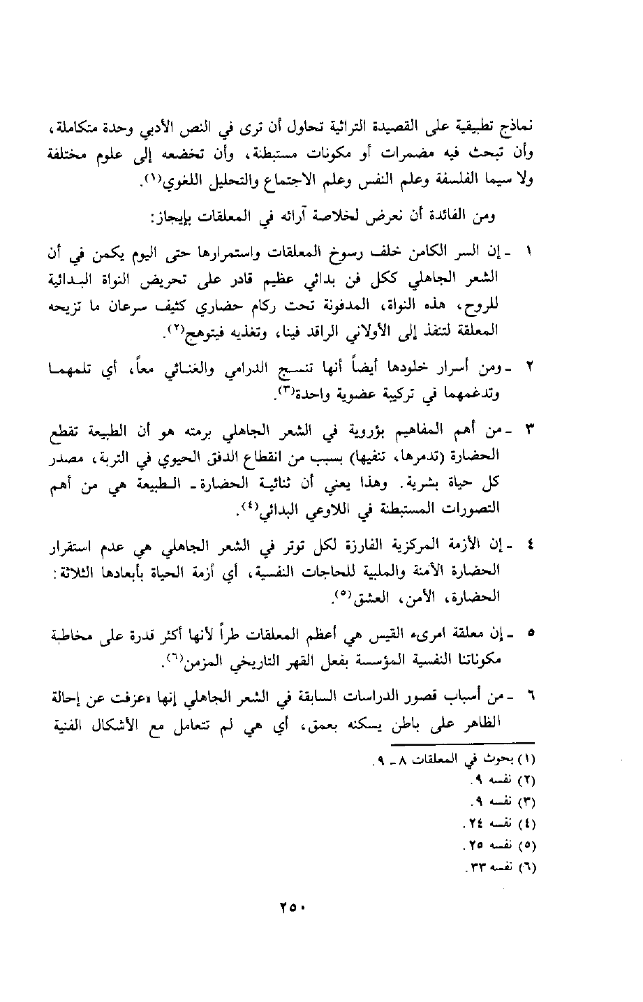 1- إن السر الكامن خلف رسوخ المعلقات واستمرارها حتى اليوم يكمن في أن الشعر الجاهلي ككل فنّ بدائي عظيم قادر على تحريض النواة البدائية للروح، وهذه النواة المدفونة تحت ركام حضاري كثيف سرعان ما تزيحه المعلقة لتنفذ إلى الأولاني الراقد فينا, وتغذيه فيتوهج2.