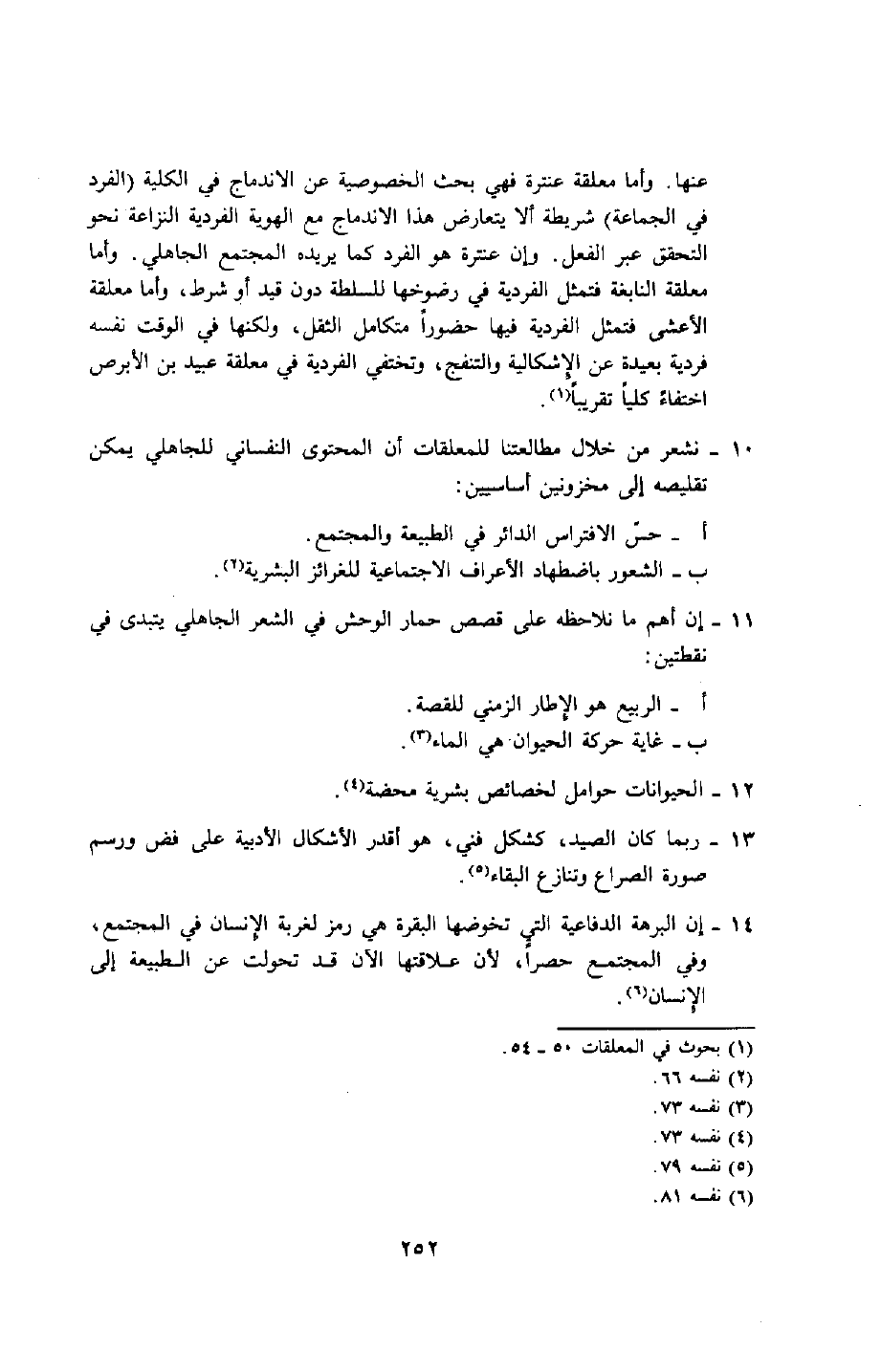 عنها. وأما معلقة عنترة فهي بحث الخصوصية عن الاندماج في الكلية "الفرد في الجماعة" شريطة ألّا يتعارض هذا الاندماج مع الهوية الفردية النزاعة نحو التحقق عبر الفعل, وإن عنترة هو الفرد كما يريده المجتمع الجاهلي. وأما معلقة النابغة فتمثل الفردية في رضوخها للسلطة دون قيد أو شرط، وأما معلقة الأعشى فتمثل الفردية فيها حضورًا متكامل الثقل، ولكنها في الوقت نفسه فردية بعيدة عن الإشكالية والتنفج، وتختفي الفردية في معلقة عبيد بن الأبرص اختفاء كليًّا تقريبًا1.