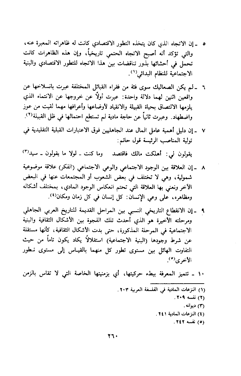 9- إن الانقطاع التاريخي النسبي بين المراحل القديمة للتاريخ العربي الجاهلي ومرحلته الأخيرة هو الذي أحدث تلك الفجوة بين الأشكال الثقافية والبنية الاجتماعية في المرحلة المذكورة، حتى بدت الأشكال الثقافية كأنها مستقلة عن شرط وجودها "البنية الاجتماعية" استقلالًا يكاد يكون تامًّا من حيث التفاوت الهائل بين مستوى تطور كلٍّ منهما بالقياس إلى مستوى تطور الأخرى5.